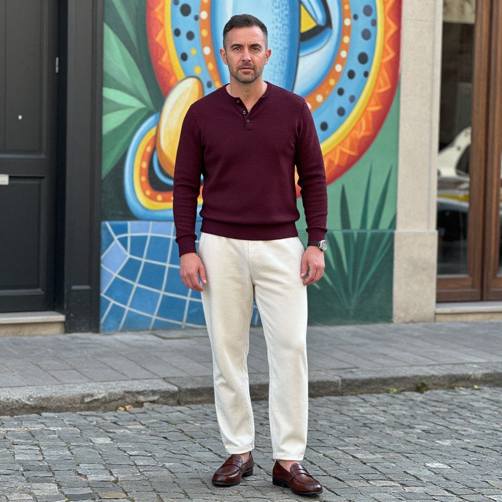 A man, bamboo fiber henley in burgundy, organic cotton sweatpants in cream, classic leather loafers, smart-casual style, vibrant murals, cobblestone streets, cameraphone style, relaxed smile, comfortable yet polished. Man has masculine face and piercing eyes