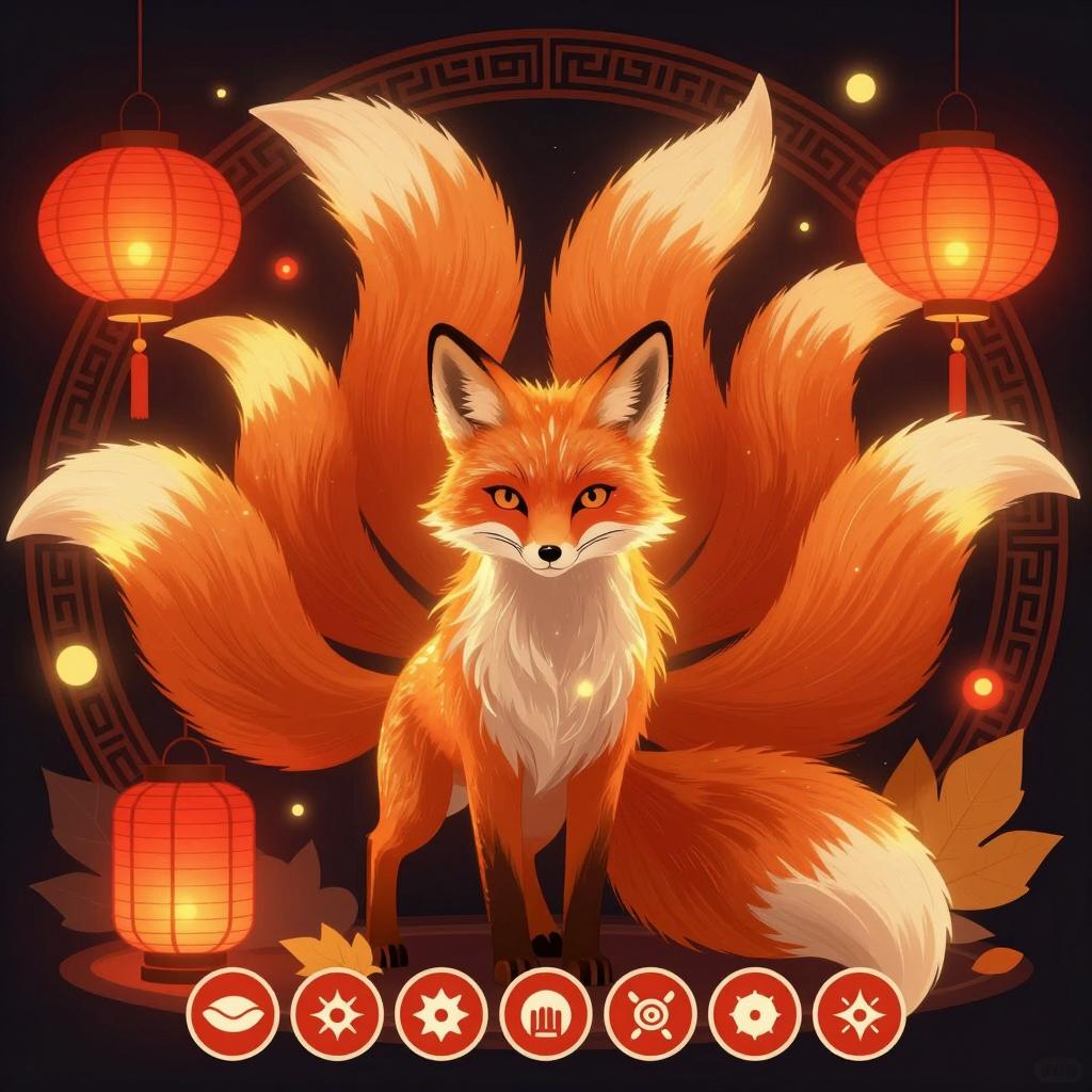 Illustration of a fox with ornate black and red feathers in its ears and tail, holding a red lantern in its mouth. Fox is sitting on a patterned surface, surrounded by multiple red lanterns with black and white accents. Fox has intricate black patterns on its fur. Background has abstract black and white patterns. Fox's tail is curled up. Fox's expression is neutral. Red lanterns hang from the top and sides. Artist's "©Shirikuro" in the bottom right corner.