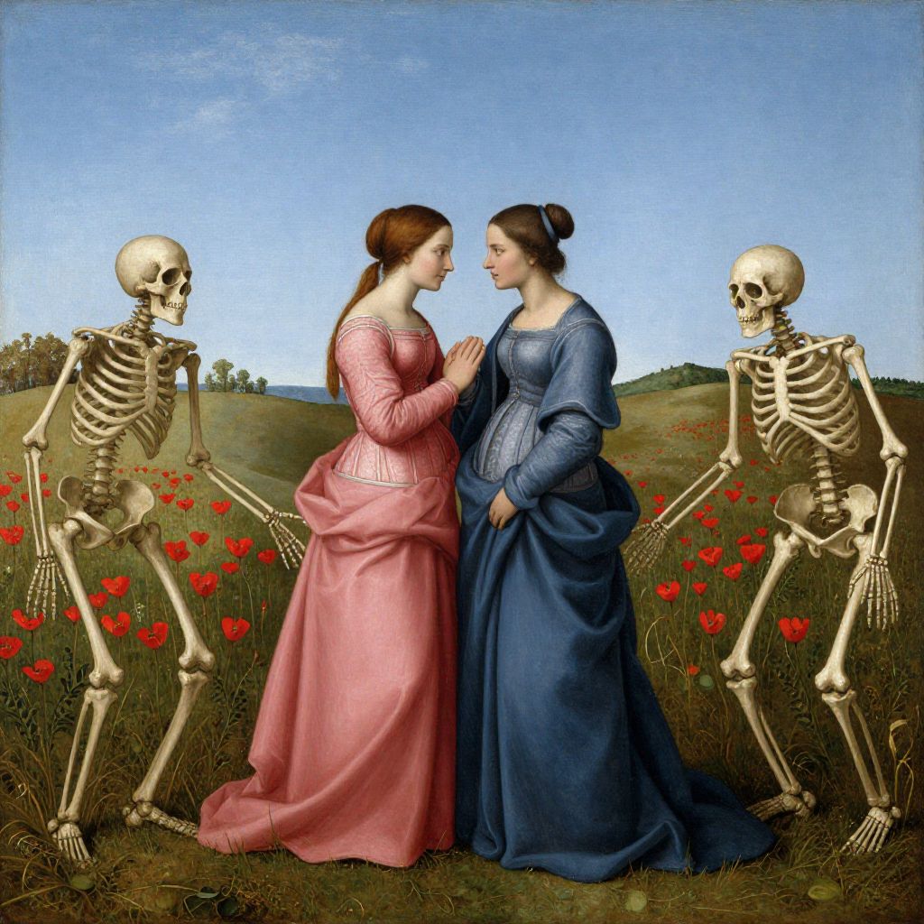 Digital art of two women in Victorian dresses, facing each other, with two skeletons standing on either side in a field of red poppies. Blue sky