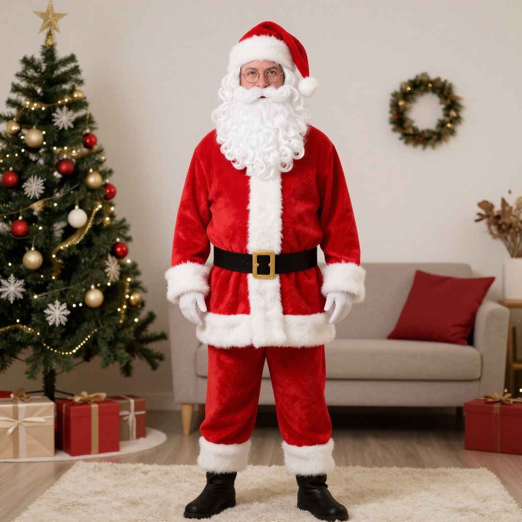 Christmas Program Attire Costume, man dressed in a santa claus outfit standing in a room