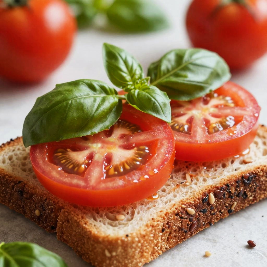 A close-up photo of a toasted bread slice topped with melted cheese, fresh tomato slices, and a basil leaf. The bread has a speckled texture, and there's a wooden surface beneath. In the background, there are whole tomatoes and dark olives, slightly out of focus. The image has a vibrant, fresh feel with bright reds and greens.