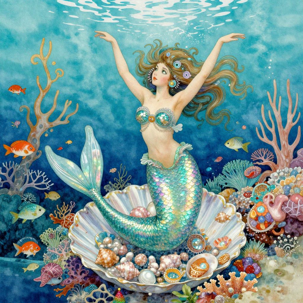 Imagine an enchanting underwater landscape reminiscent of vintage Japanese ukiyo-e woodblock prints, portraying a mythical mermaid princess with cascading silver hair and iridescent scales. She sits elegantly atop a colossal shell, as if it were her royal carriage, drifting effortlessly through a surreal coral garden filled with glowing marine creatures. This scene should evoke a sense of awe and magic from the unique vantage point beneath the surface, capturing the ethereal beauty of the mermaid princess who appears both regal and tranquil, gazing towards a hazy horizon where undulating currents and celestial light merge into an abstract tapestry of wonder.