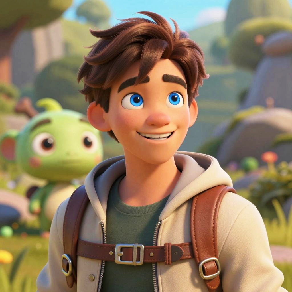 Animated male character with curly brown hair, wearing white suit, black and white striped scarf, brown shoes, jumping mid-air. Red background. His facial expression is cheerful. He is in a dynamic, mid-jump pose.