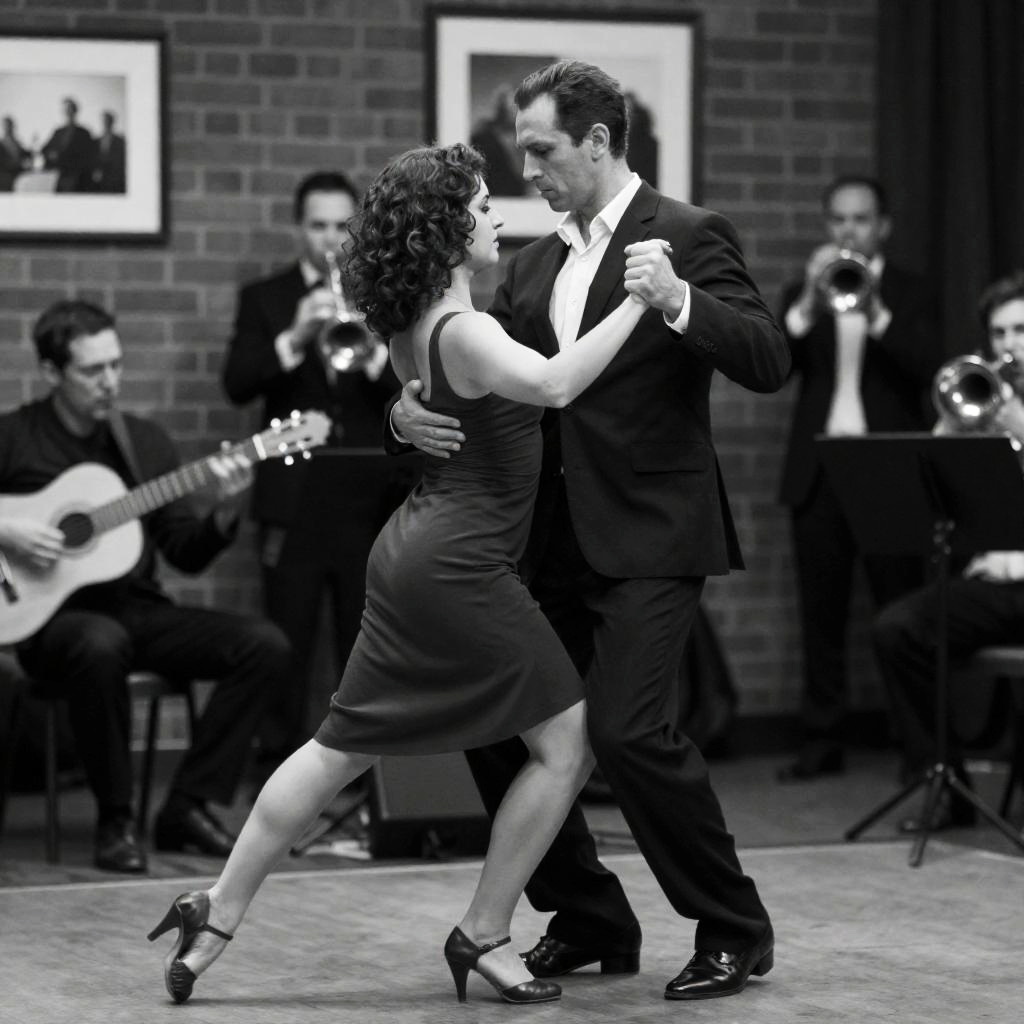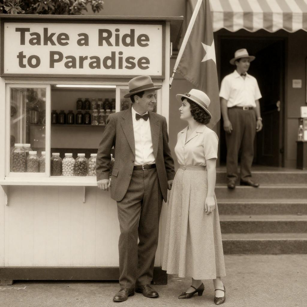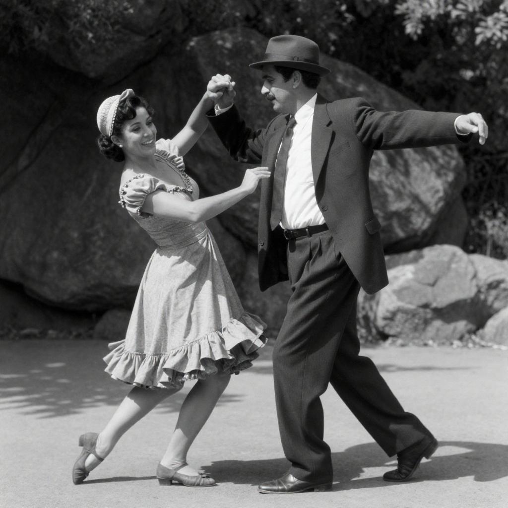 Black-and-white photograph of a man and a woman dancing outdoors. Man in dark suit, tie, and fedora, right arm outstretched. Woman in frilled dress, headpiece, and short sleeves, leaning forward, holding his hand. Rocky, tree-filled background. Man's mustache visible. Woman's smile intense. Both mid-step. Sunlight casting shadows.