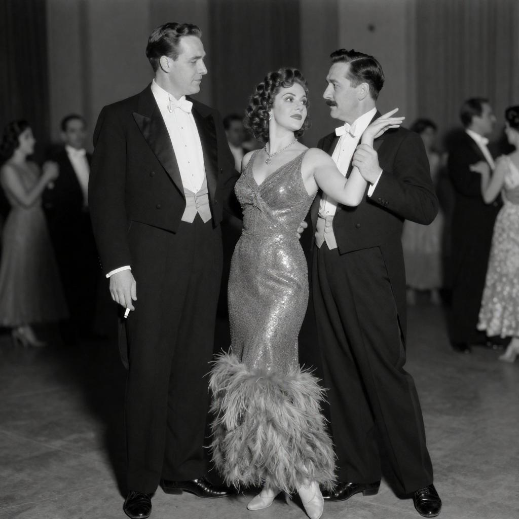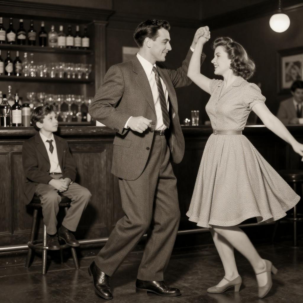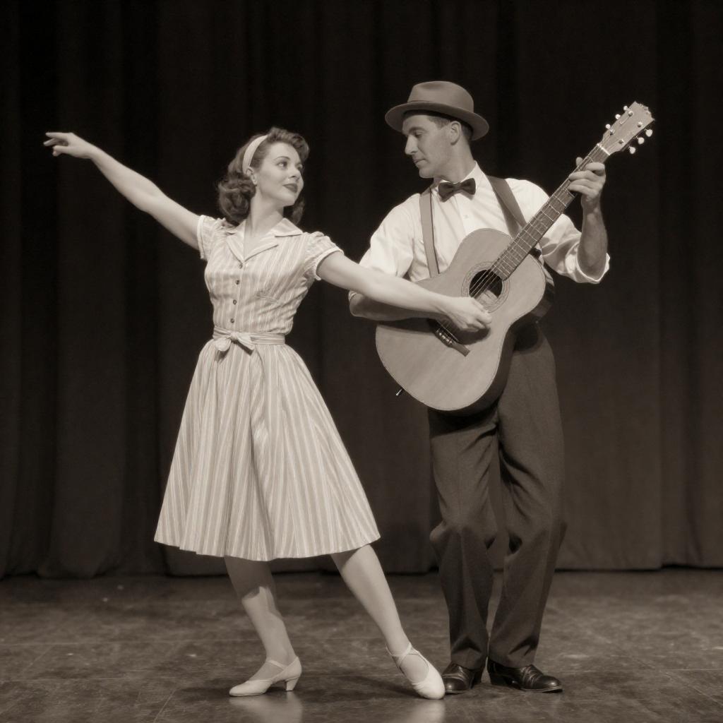 Black-and-white photograph of a man and woman dancing outdoors against a natural backdrop of rocks and trees. The man wears a dark suit, tie, and fedora with a mustache, extending his right arm. The woman wears a frilled short-sleeve dress and a headpiece, smiling as she leans forward holding his hand. Both are captured mid-step with sunlight casting shadows.
