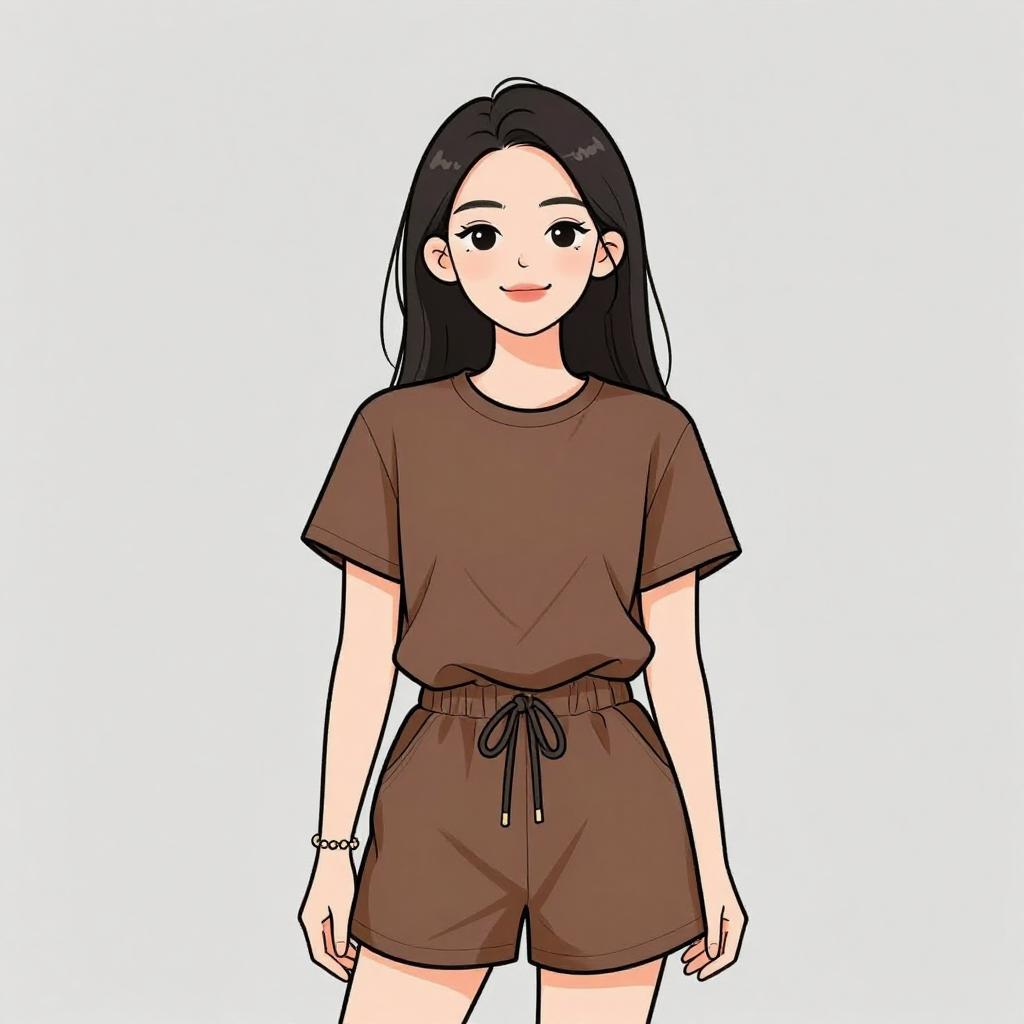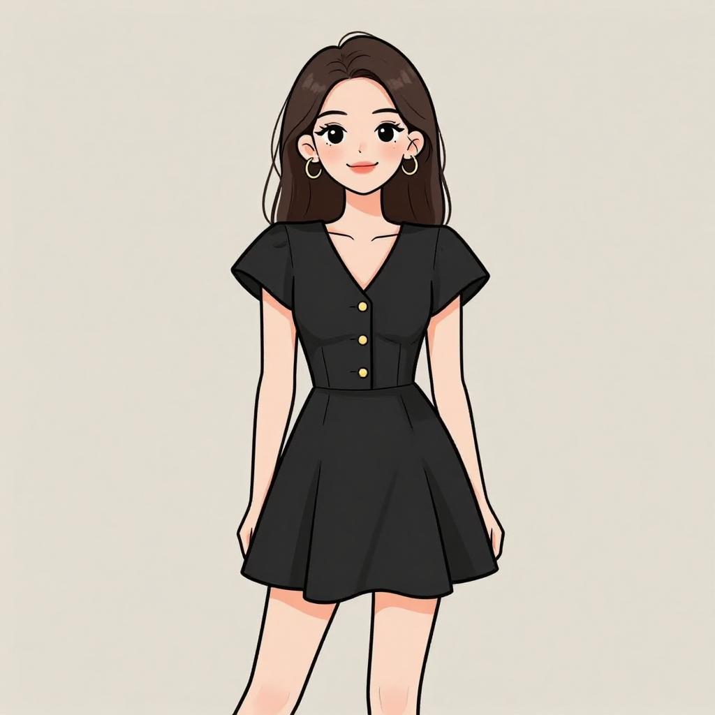 Woman with pretty face and pretty hair. smiling Woman, minimalist, oversized black shirt dress, collar, button-down front, short dolman sleeves, mid-thigh length, relaxed fit, single visible button, plain design, fabric appears light and soft, no visible accessories, simple gold band on middle finger, plain white studio background. --sref 1467