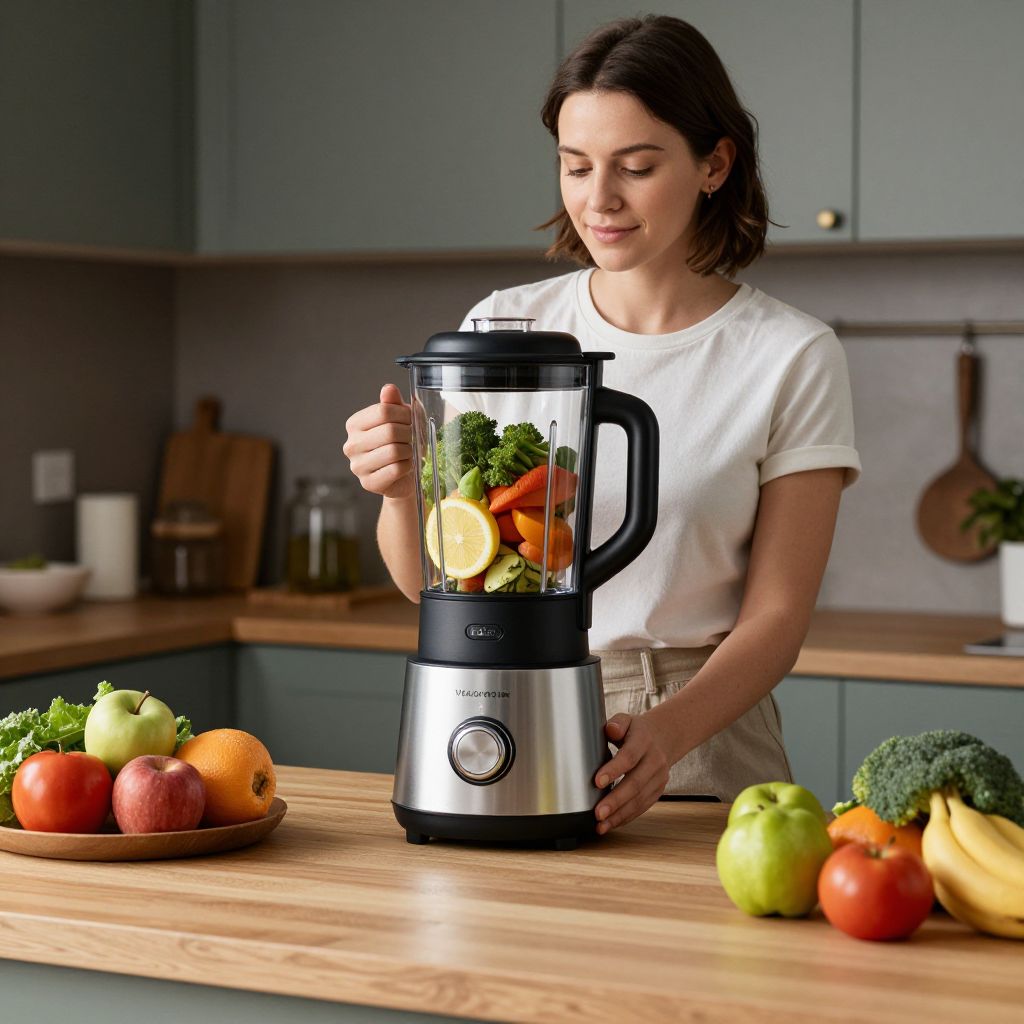 Woman preparing healthy meals in a modern kitchen, utilizing a sleek blender alongside fresh fruits and vegetables displayed on a wooden countertop.