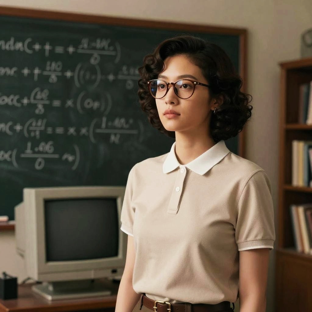 Photograph of a serious-looking woman with medium brown skin and dark hair in an updo, wearing round glasses and a brown blouse with a white collar. She's holding a pointer and standing in front of a chalkboard filled with white lines and text. The background is blurry with dim lighting, creating a focused effect on her. She looks thoughtful and attentive.