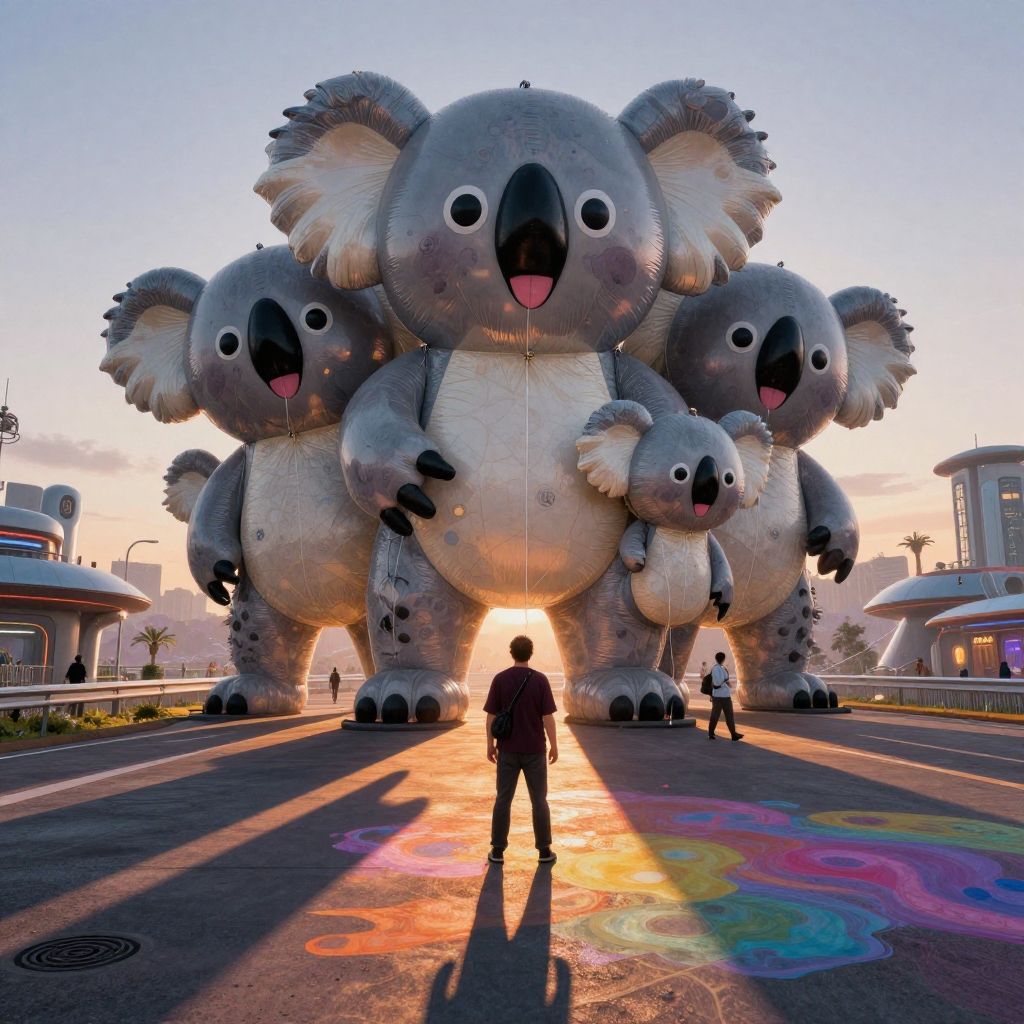 Cinematic, 9:16 shot.Dynamic view of an ancient goofy 12m tall disturbing group of semi-unflated (smiling) funny Koala-shaped baloons (and a man in front of them) in Simon Stalenhag's style from a futuristic era, at dusk hour with very long and realistic projected shadows, detailed frame, painting looks to be life like, on the ground, magical multicolored ink, high quality, imagination, fantasy art, vivid magical colors.The shot takes place near an highway.Many details everywhere. Ray-Tracing. Anti-Aliasing. Realistic reflections. Realistic soft shadows.Slightly desaturated colors. Insane quality. Insane resolution. Insane details. Masterpiece.Life-Like Photorealism. 16k resolutionBy Simon Stalenhag.