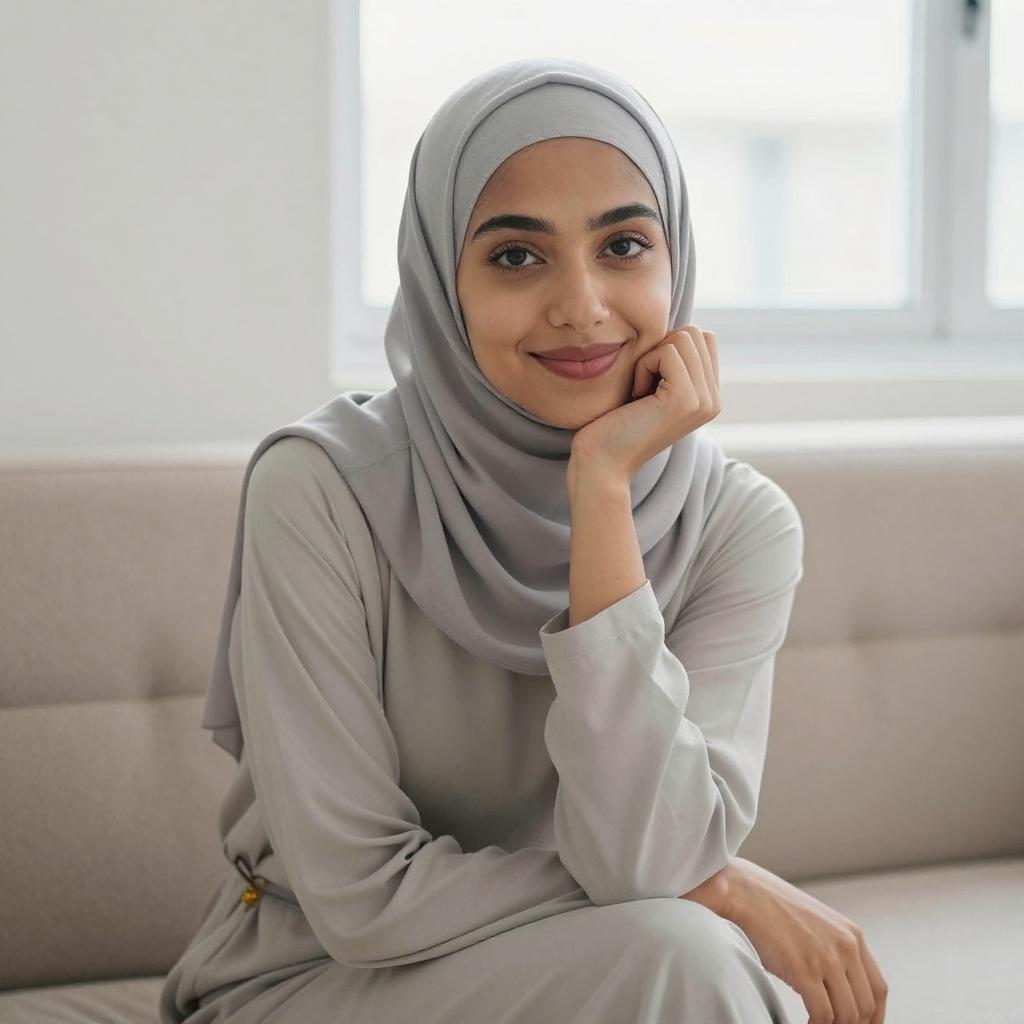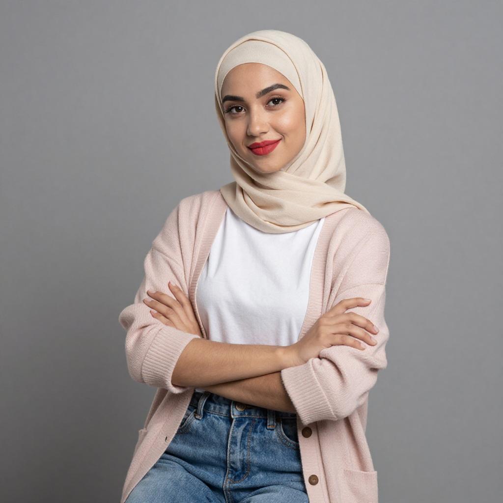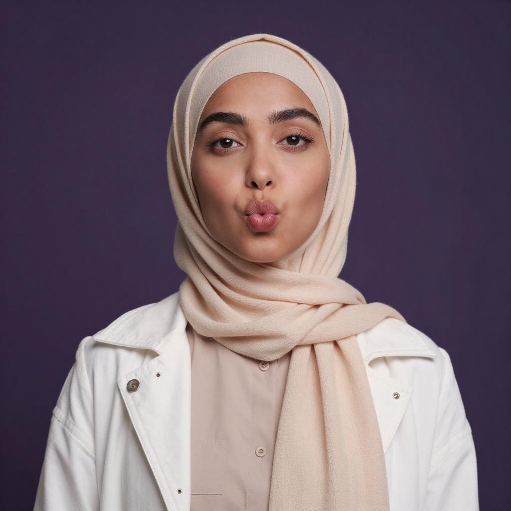 Photograph of a young woman with light brown skin and dark eyes, wearing a beige hijab, beige shirt, and white jacket. She is puckering her lips in a playful kiss pose, with a dark, purple-lit background. Her arms are behind her back.