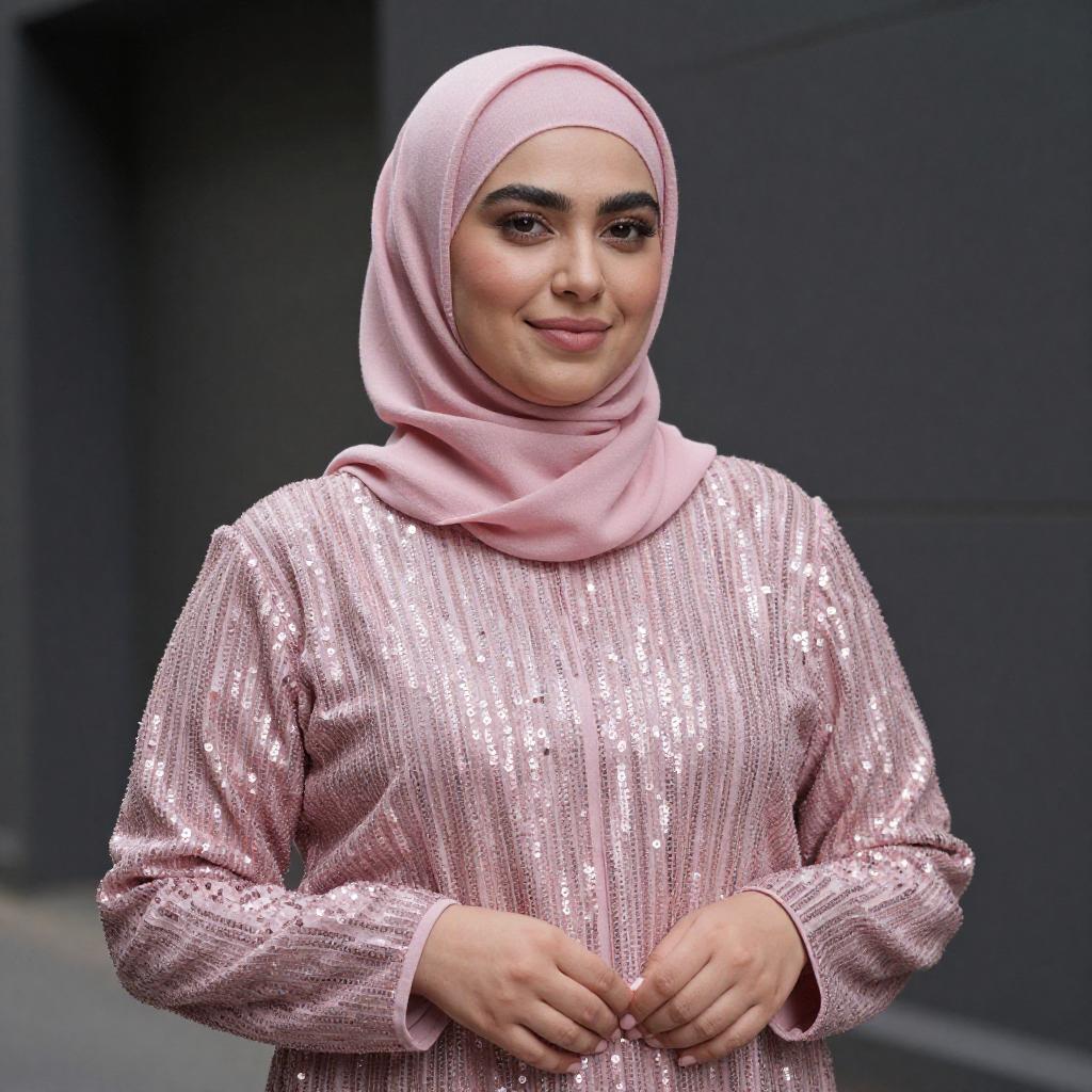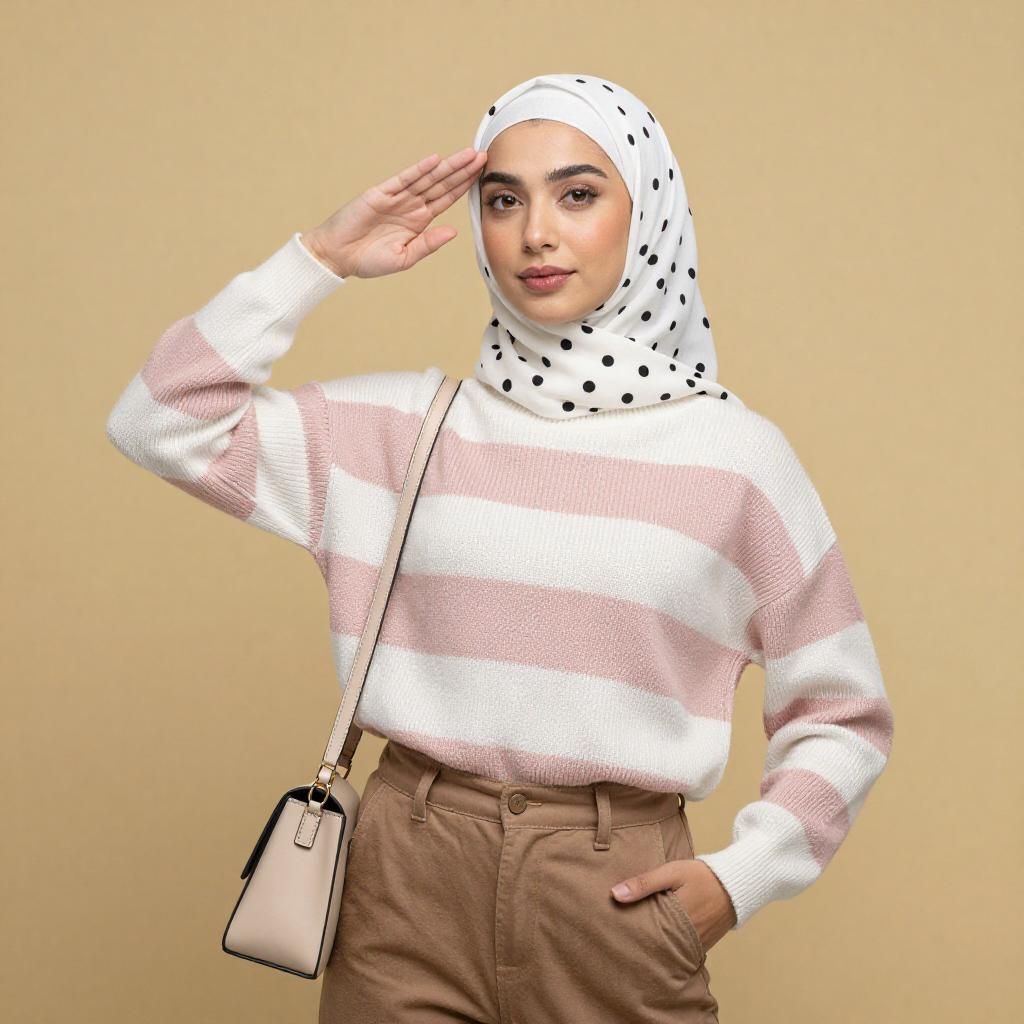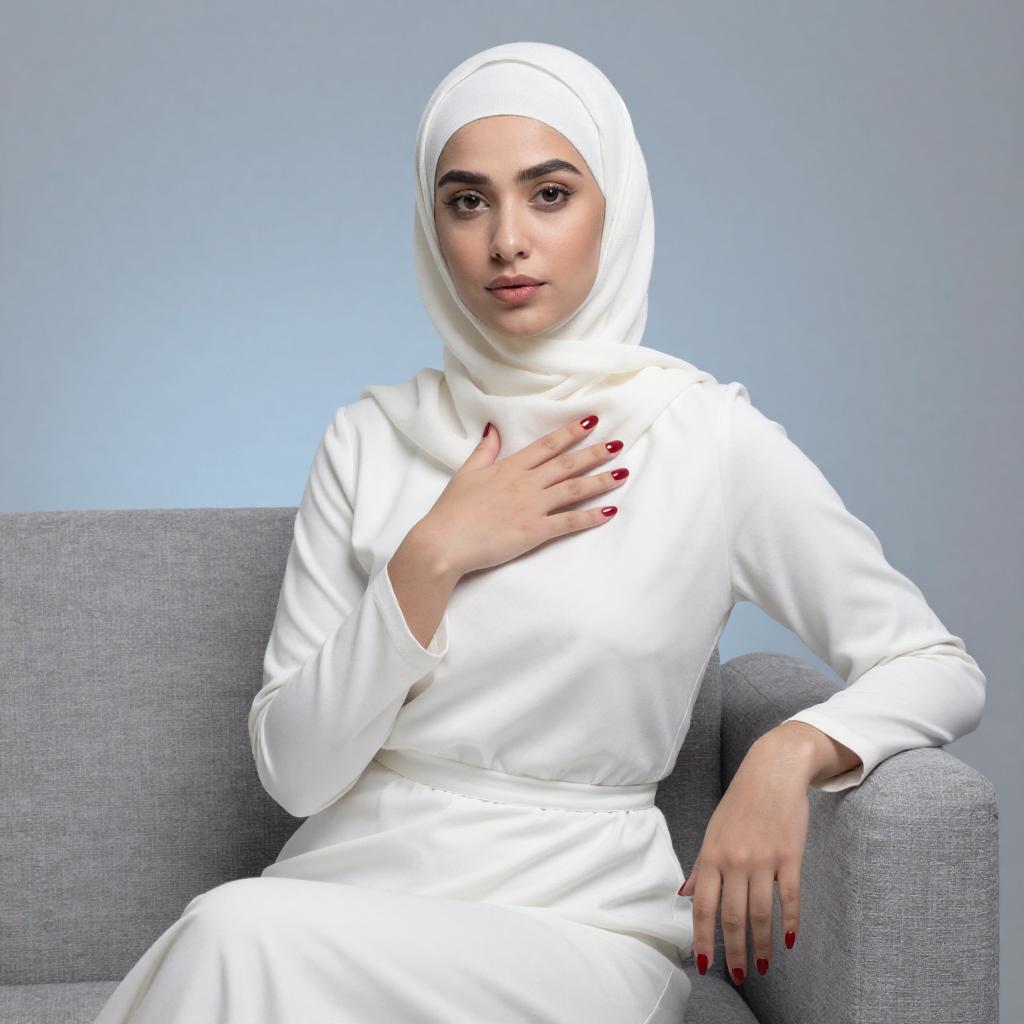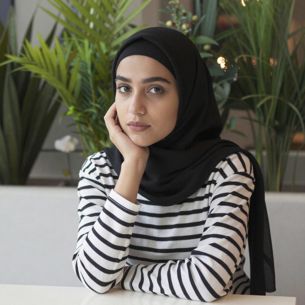 Photograph of a young woman with light brown skin and dark eyes, wearing a beige hijab, beige shirt, and white jacket. She is puckering her lips in a playful kiss pose, with a dark, purple-lit background. Her arms are behind her back.