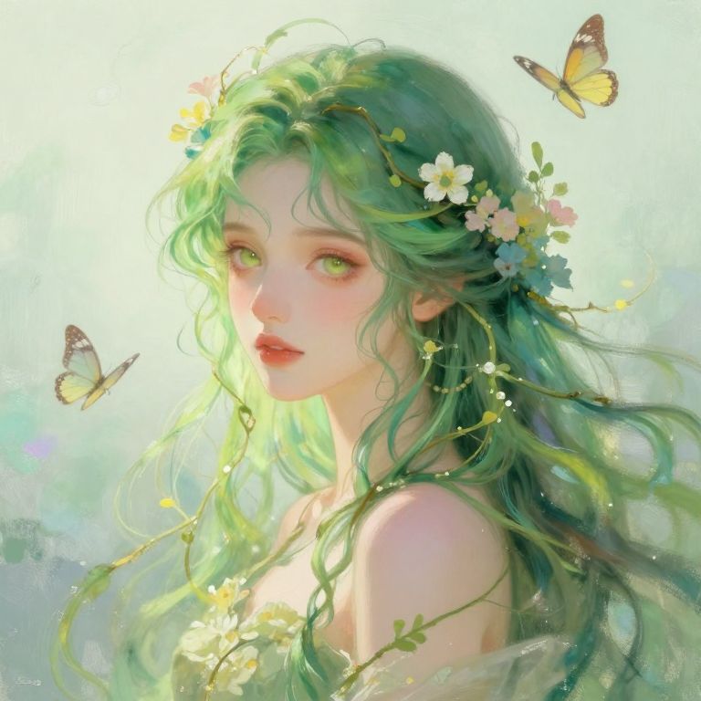 Portrait of Yorlde, a serene nature spirit with flowing emerald hair intertwined with vines and flowers, soft glowing eyes, surrounded by fluttering butterflies, impressionistic fantasy art with gentle brush strokes and pastel palette