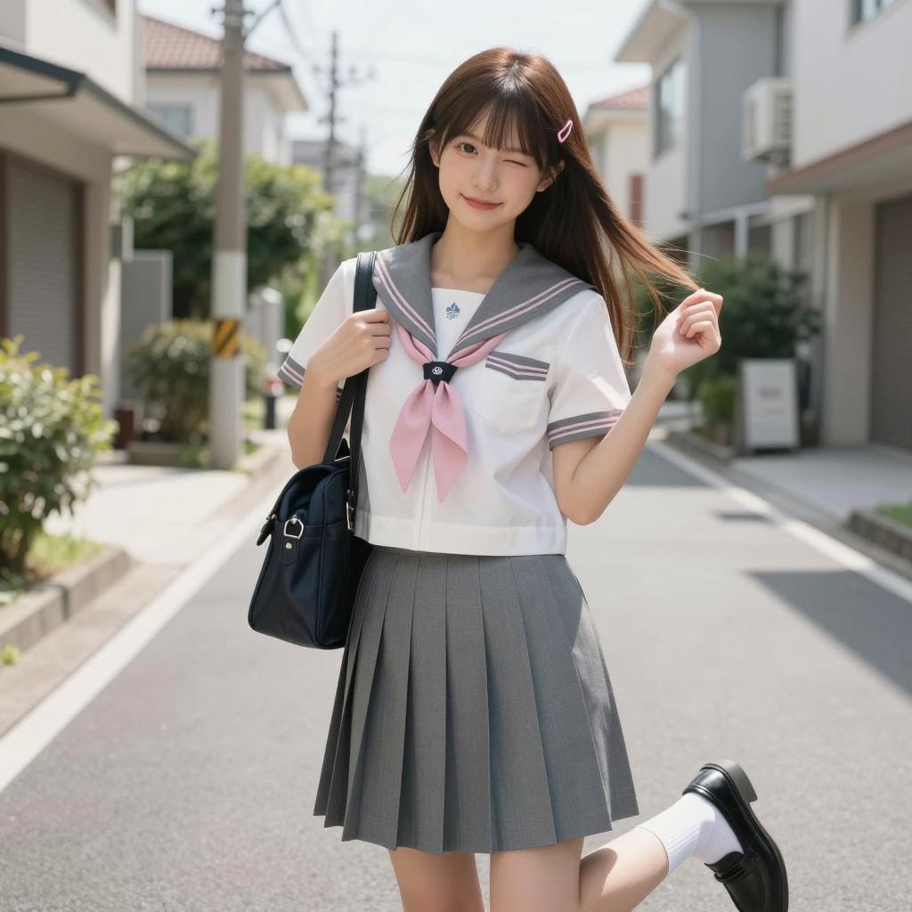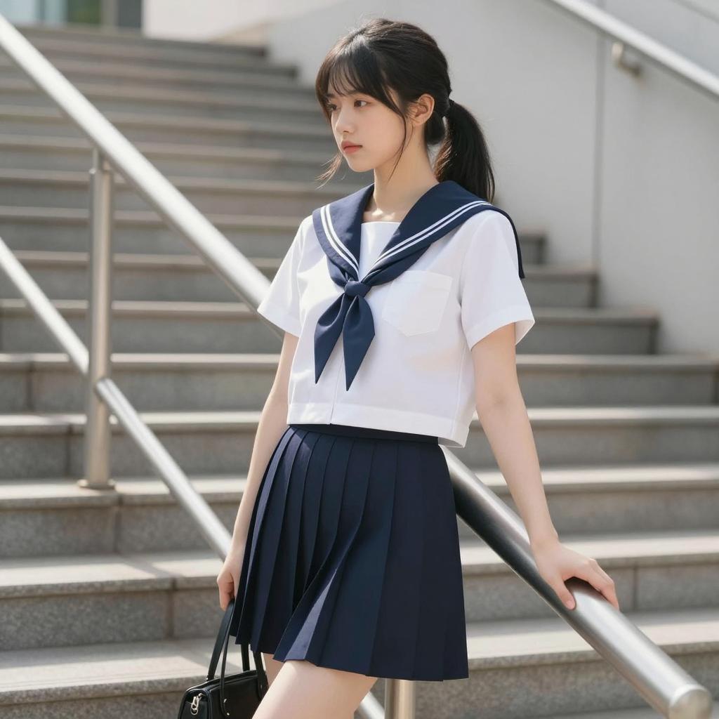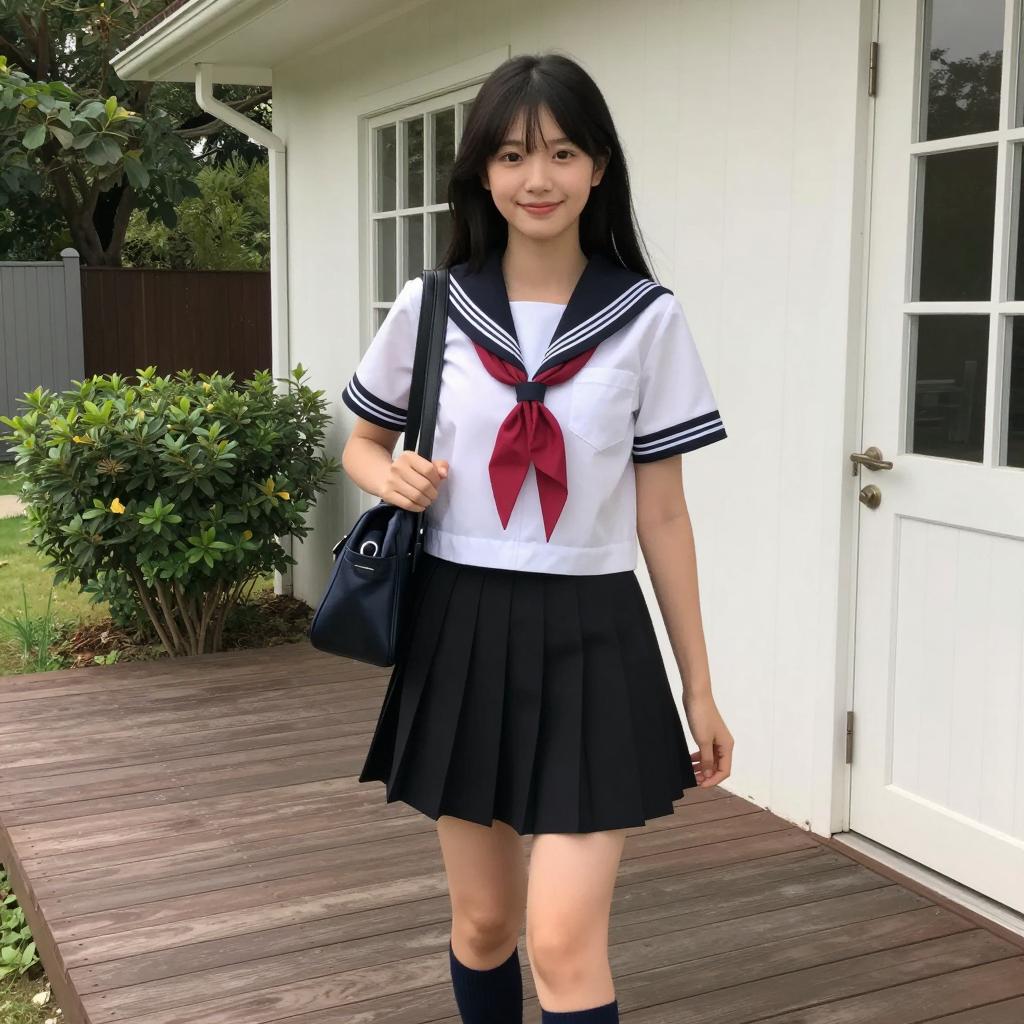 Siren costume, photograph of a blonde woman, standing in a sunlit hallway, wearing a light blue, short-sleeved sailor dress with dark blue stripes and a ribbon tie, straight bangs, casual smile, potted plants in the background, bright daylight, blurred hallway, realistic, daytime, realistic style, soft lighting, outdoor setting, full body shot