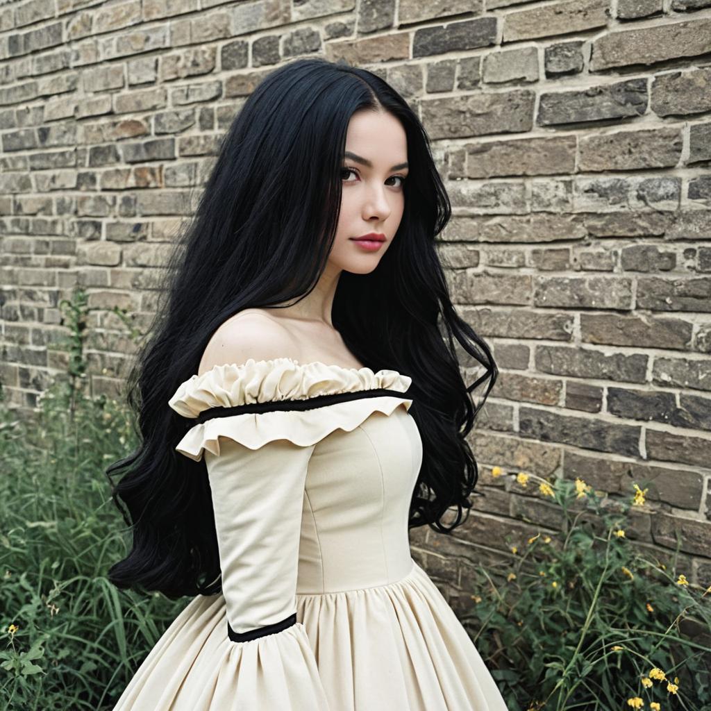 Durham Glaster, cosplay costume female character long black wild hair beige off shoulder dress