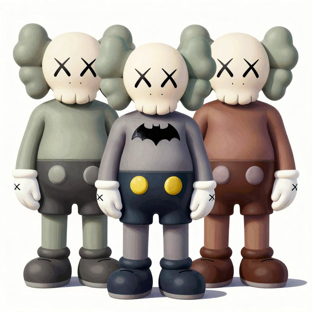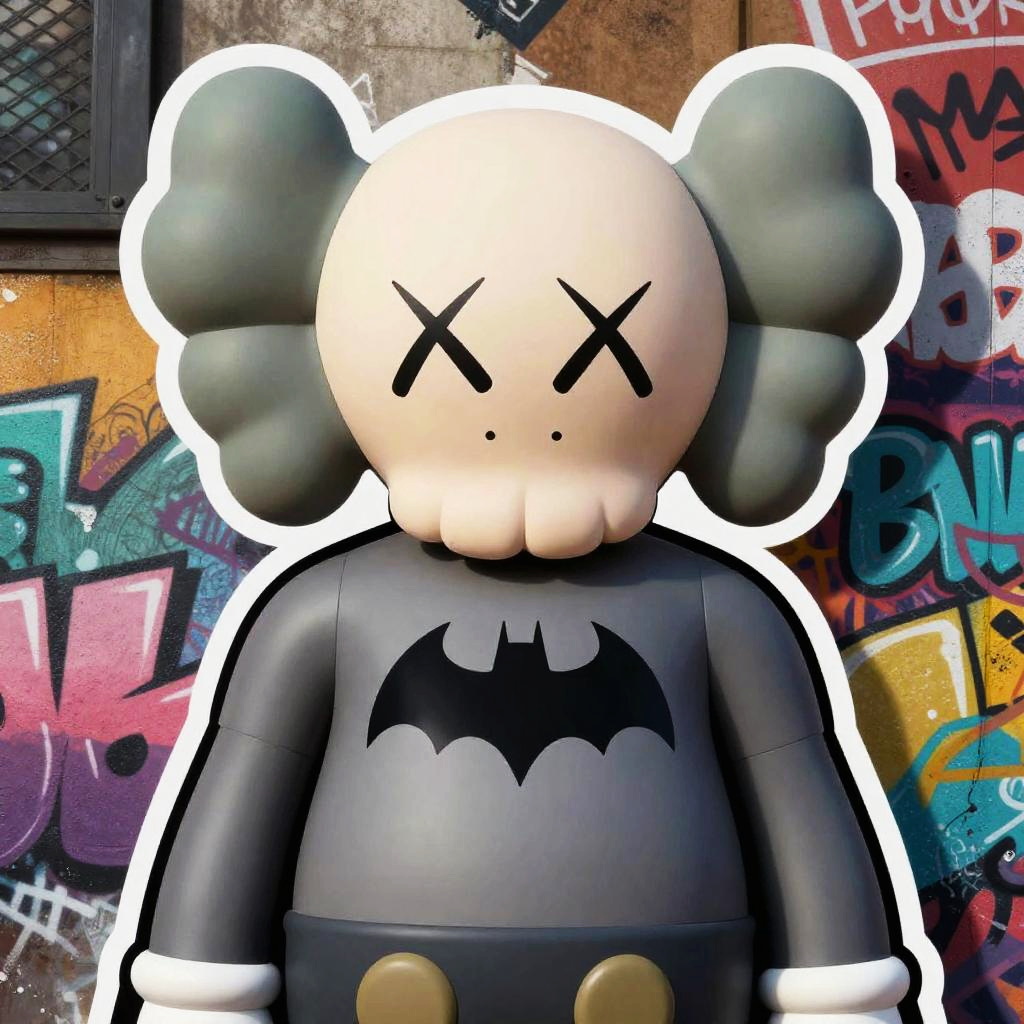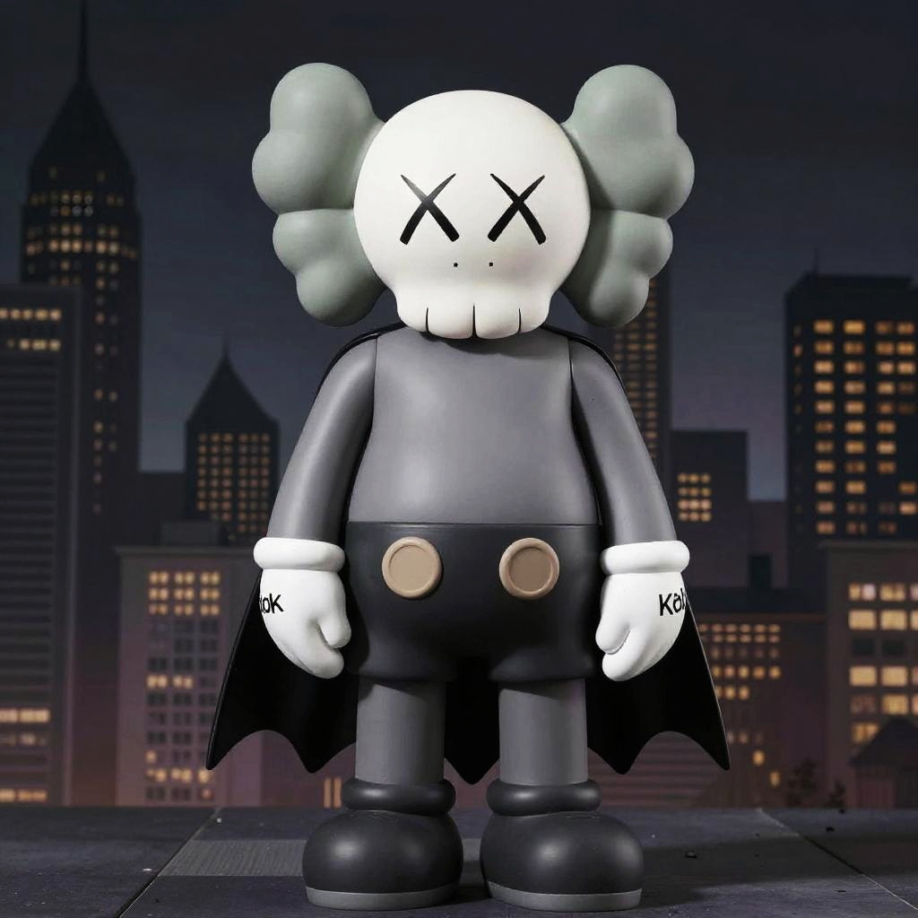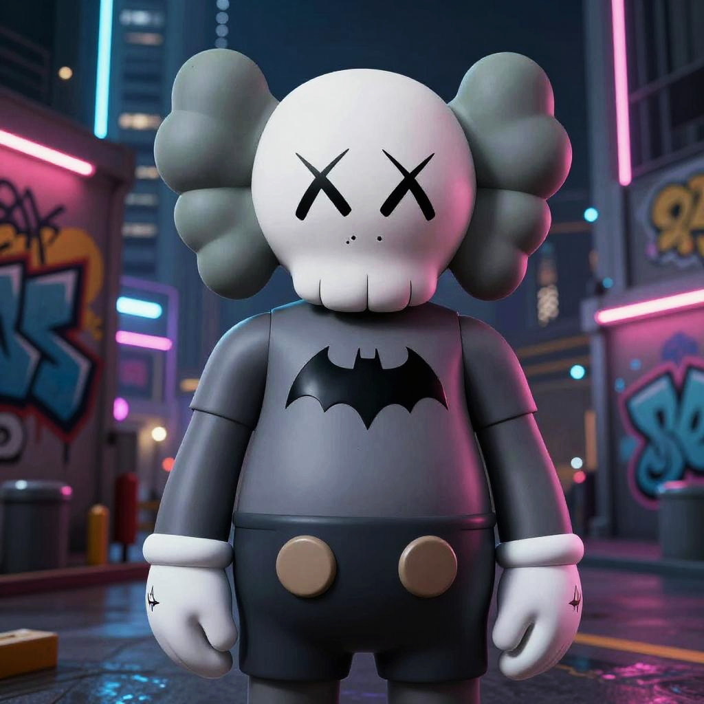 Creative Batman Kaws mashup showing Batman with Kaws’S typical skull-and-crossbones face design, situated in a futuristic cityscape with neon lighting and stylized graffiti murals, combining dark heroic themes with playful urban art style.