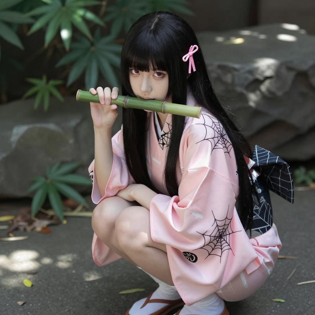 Asian woman with long black hair, pink eyes, and a pink hair ribbon. She wears a black kimono over a pink kimono with white and red accents. A green bamboo stick is in her mouth. She looks directly at the camera. Background is plain and light-colored.