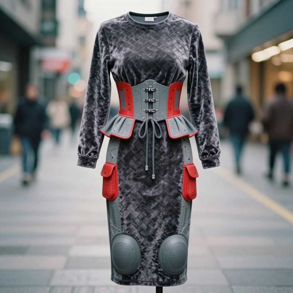 Photograph of a fashion mannequin in a city street background. The mannequin wears a long, dark gray velvet dress with a quilted pattern. The dress is cinched at the waist with a bold, gray corset featuring red accents and lacing. Attached to the corset are two red pouches and gray, circular, textured pads. The street backdrop is blurred, showing pedestrians and storefronts with soft, urban lighting. The image blends urban street photography with fashion photography, highlighting the detailed textures and vibrant colors of the dress.