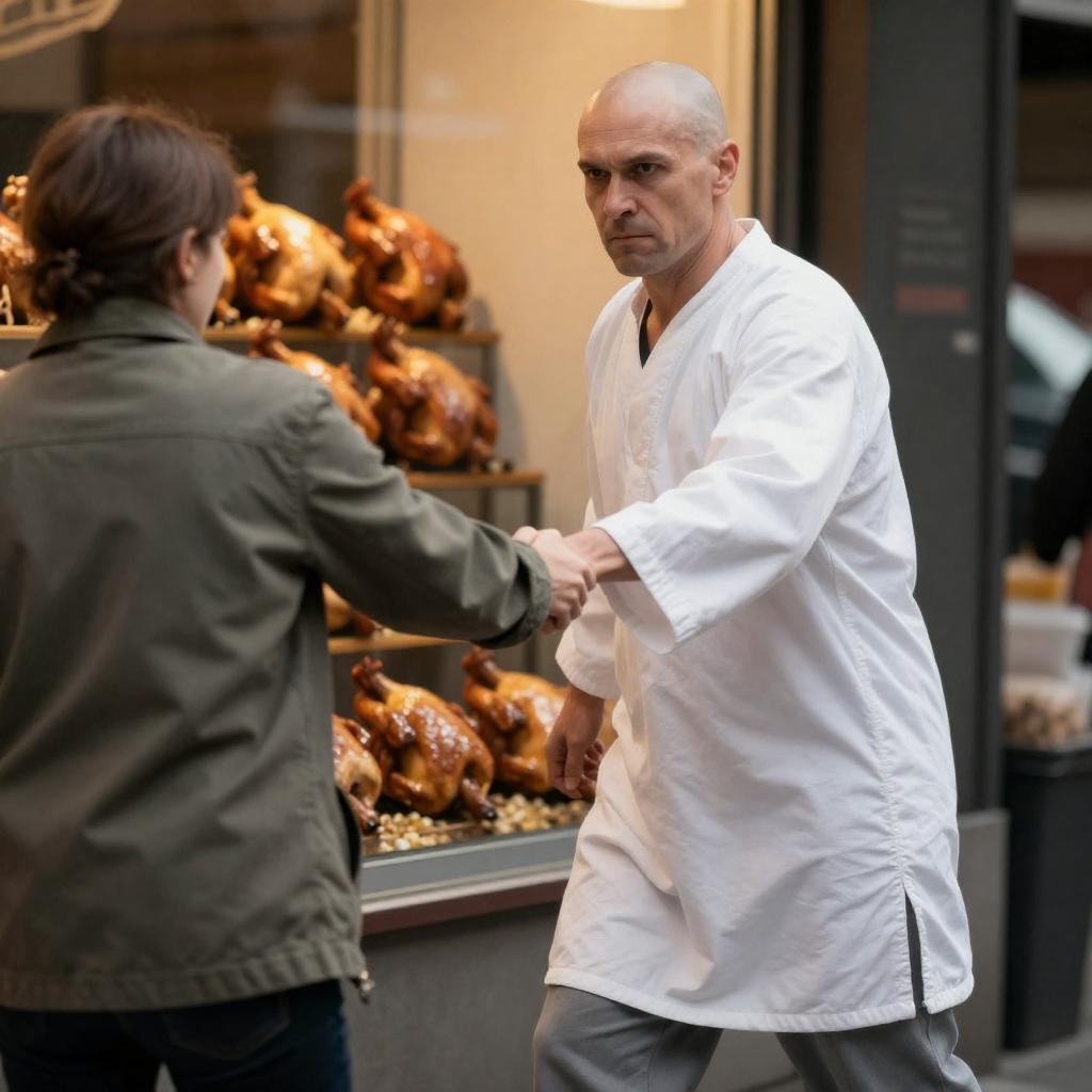 Photograph of a bald man in white robes and gray pants holding a person's arm, pulling them away from a shop window. The shop window displays numerous roasted chickens. The man has a stern expression. The person has brown hair, wears a green jacket, and looks back over their shoulder. The setting is urban, with warm lighting.