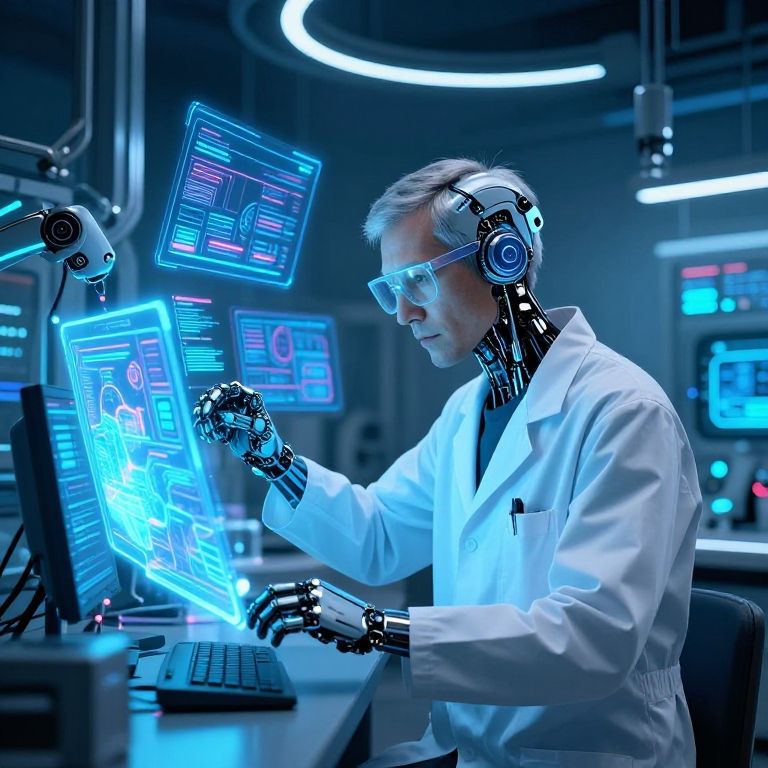 High-angle shot, dimly lit room with a futuristic ambiance, half-rear lighting highlights subject's profile, eyes fixed on holographic display, fingers typing away on virtual keyboard, brain-computer interface headset integrated into his skull, metallic implants visible beneath translucent skin, cyberpunk aesthetic, neon hues, pulsing energy fields. Man has masculine face and piercing eyes