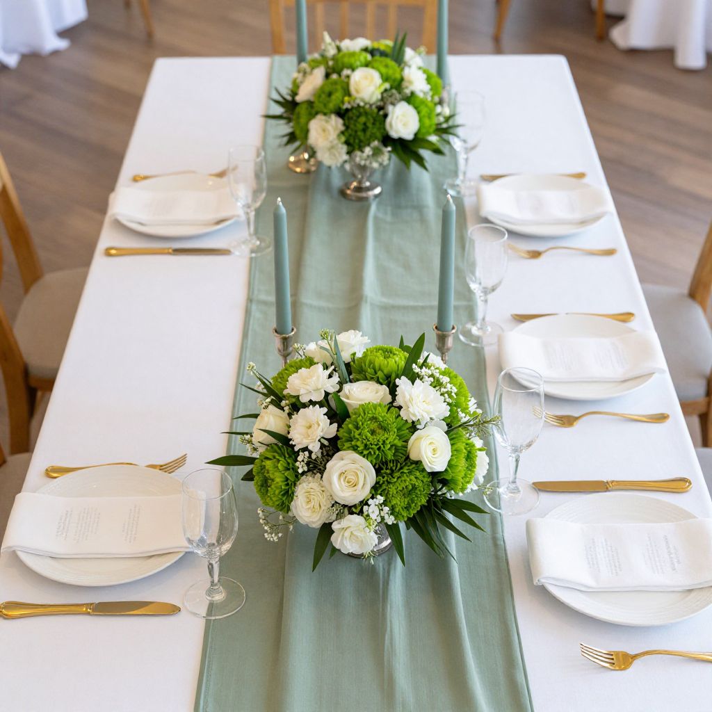 Rectangular table elegantly set with two symmetrical floral centerpieces featuring green and white blooms, complemented by tall teal candles in silver holders, all arranged along a sage-green runner, flanked by neatly placed gold cutlery, white plates, and folded napkins.