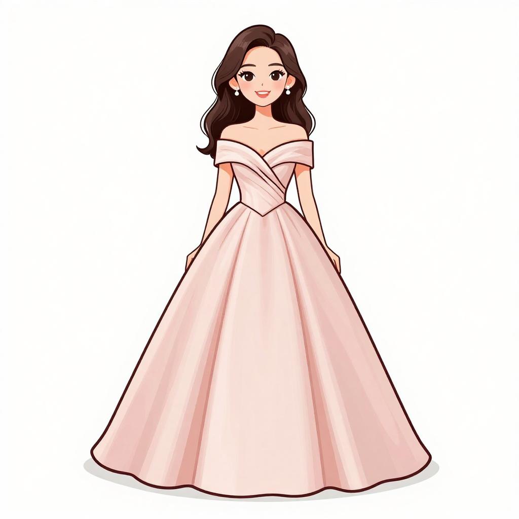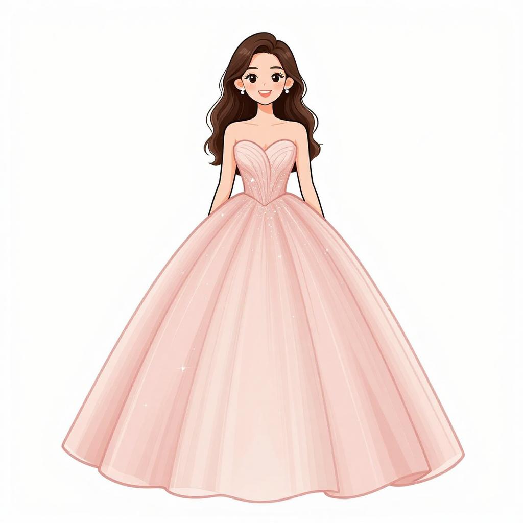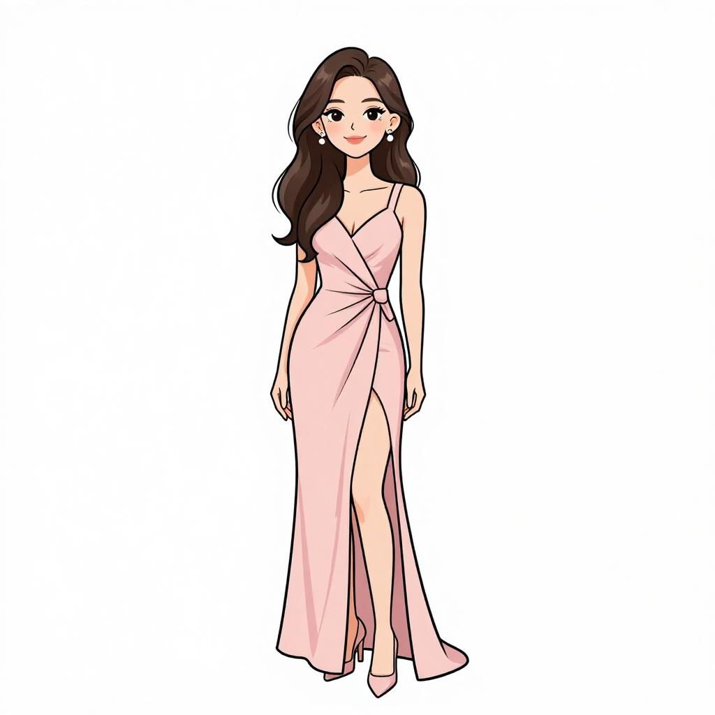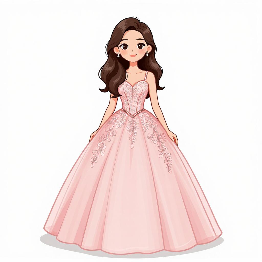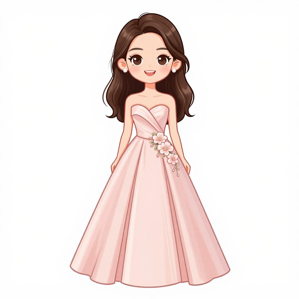 Woman with pretty face and pretty hair. smiling Woman, classic elegance, strapless satin gown in blush pink, fitted bodice, flared skirt with pockets and gentle pleating, floor-length, floral appliqué on the hip, simple stud earrings, hair styled in loose waves, plain white background. --sref 1467