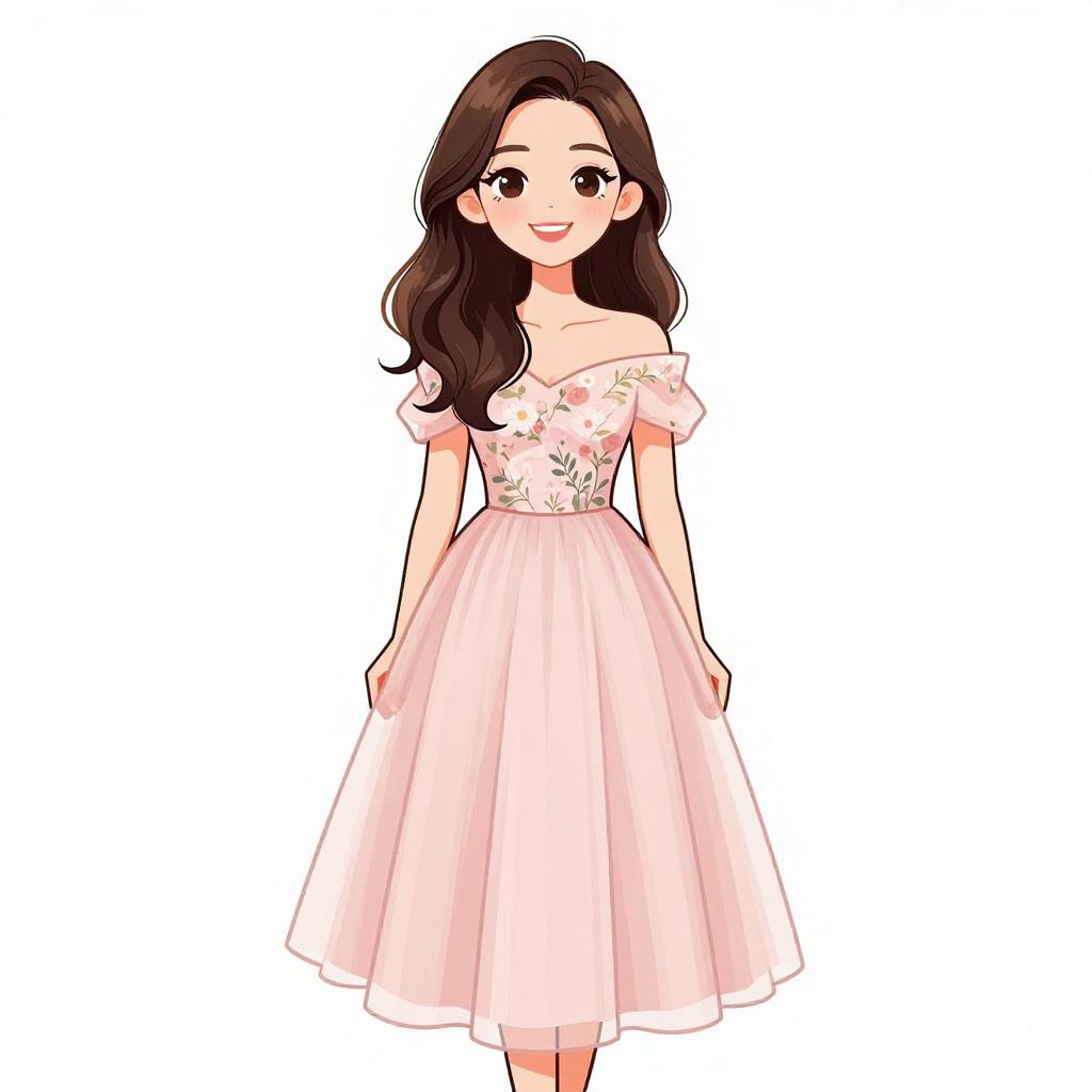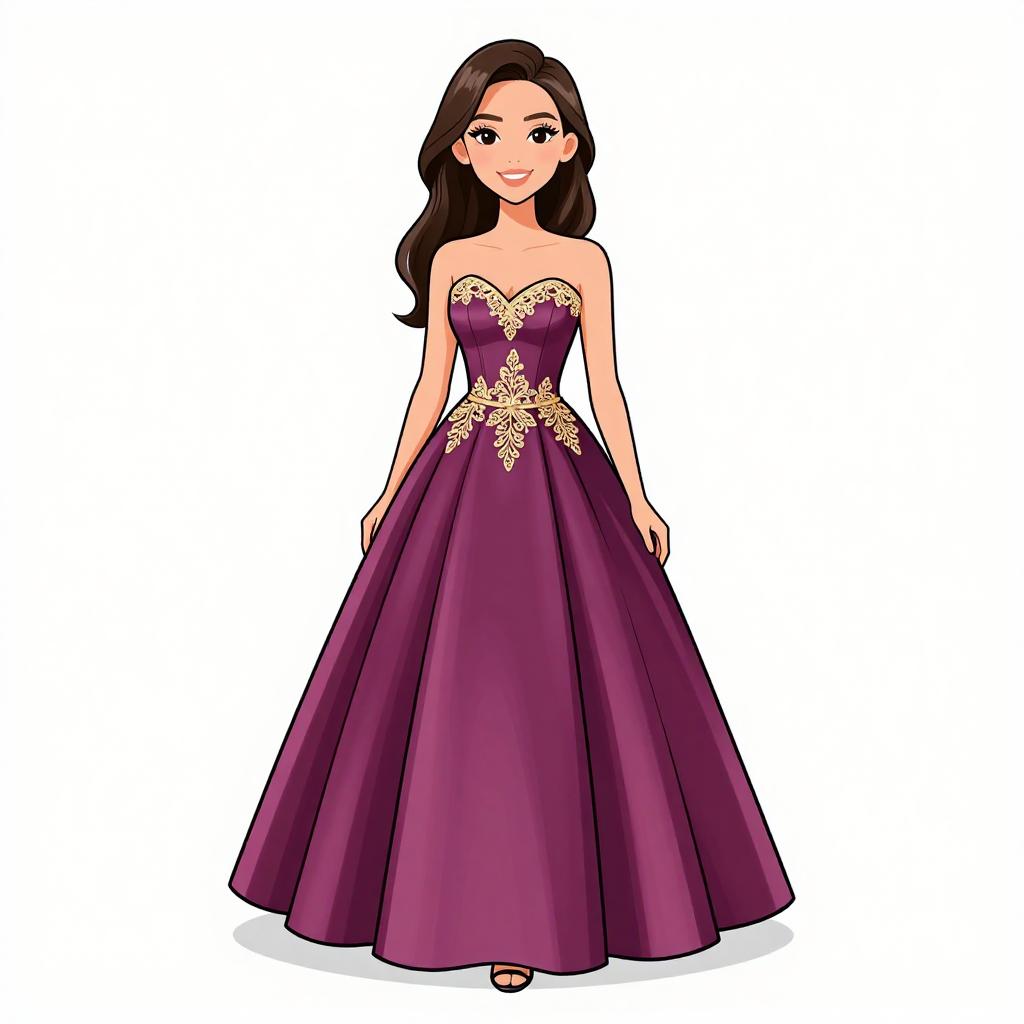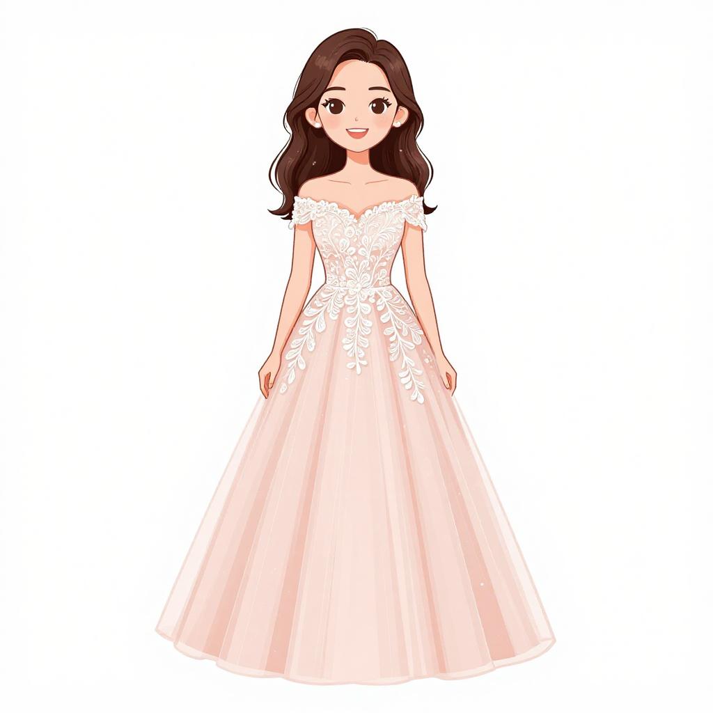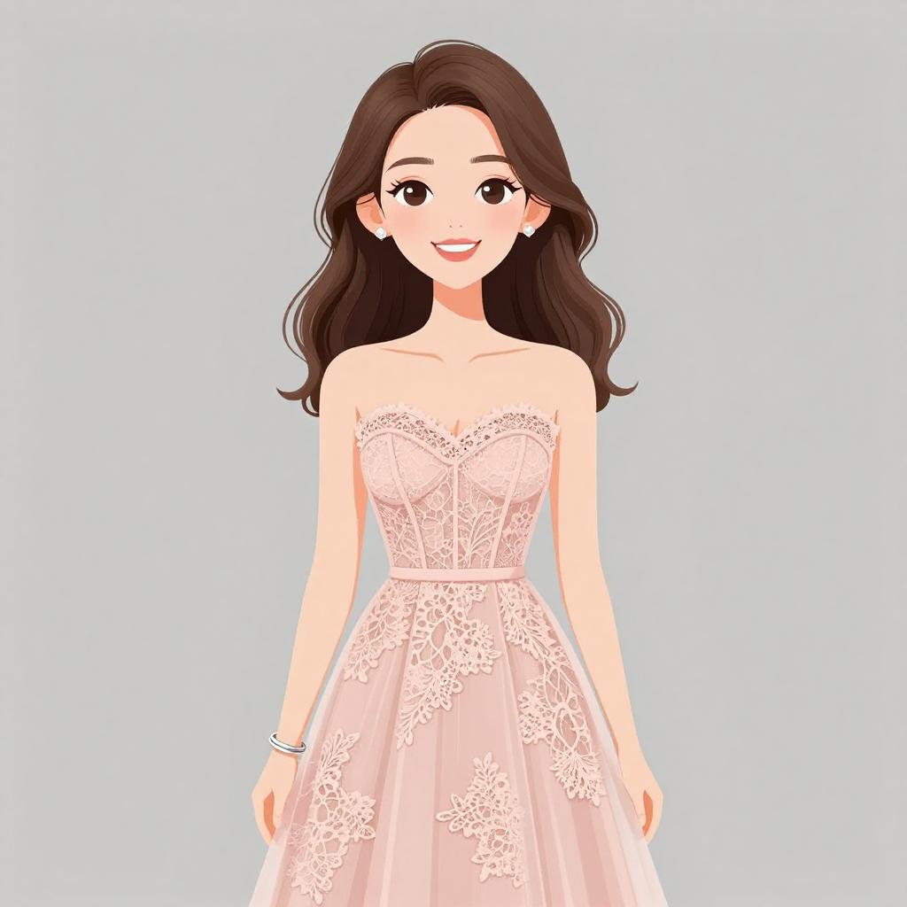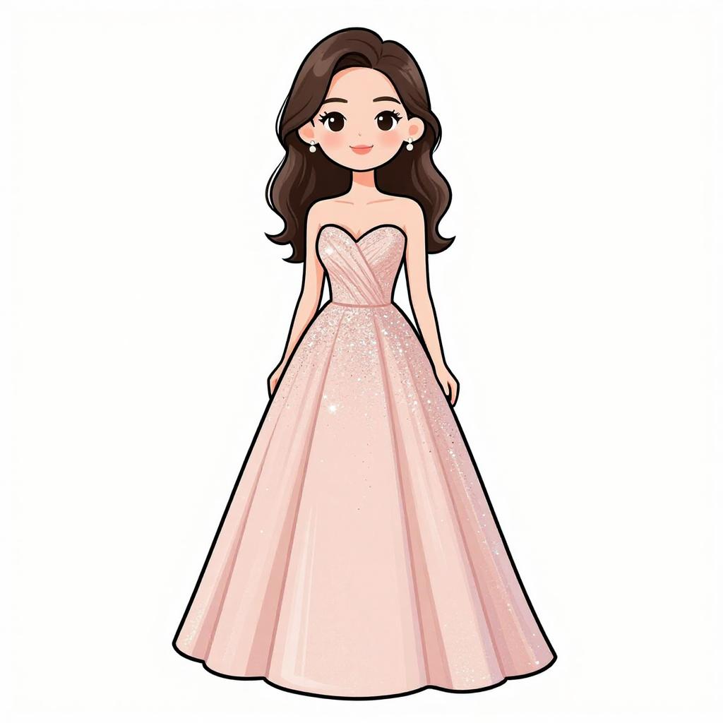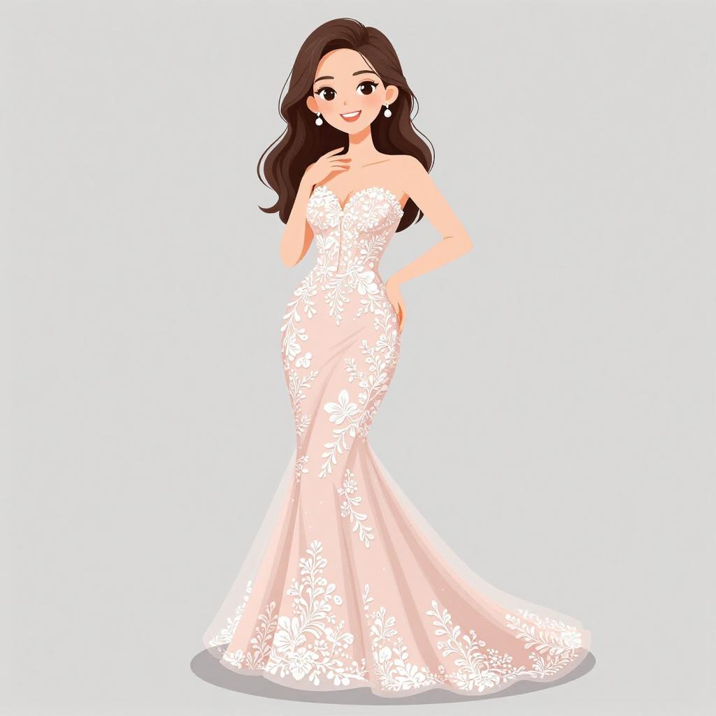 Woman with pretty face and pretty hair. smiling Woman, classic elegance, strapless satin gown in blush pink, fitted bodice, flared skirt with pockets and gentle pleating, floor-length, floral appliqué on the hip, simple stud earrings, hair styled in loose waves, plain white background. --sref 1467