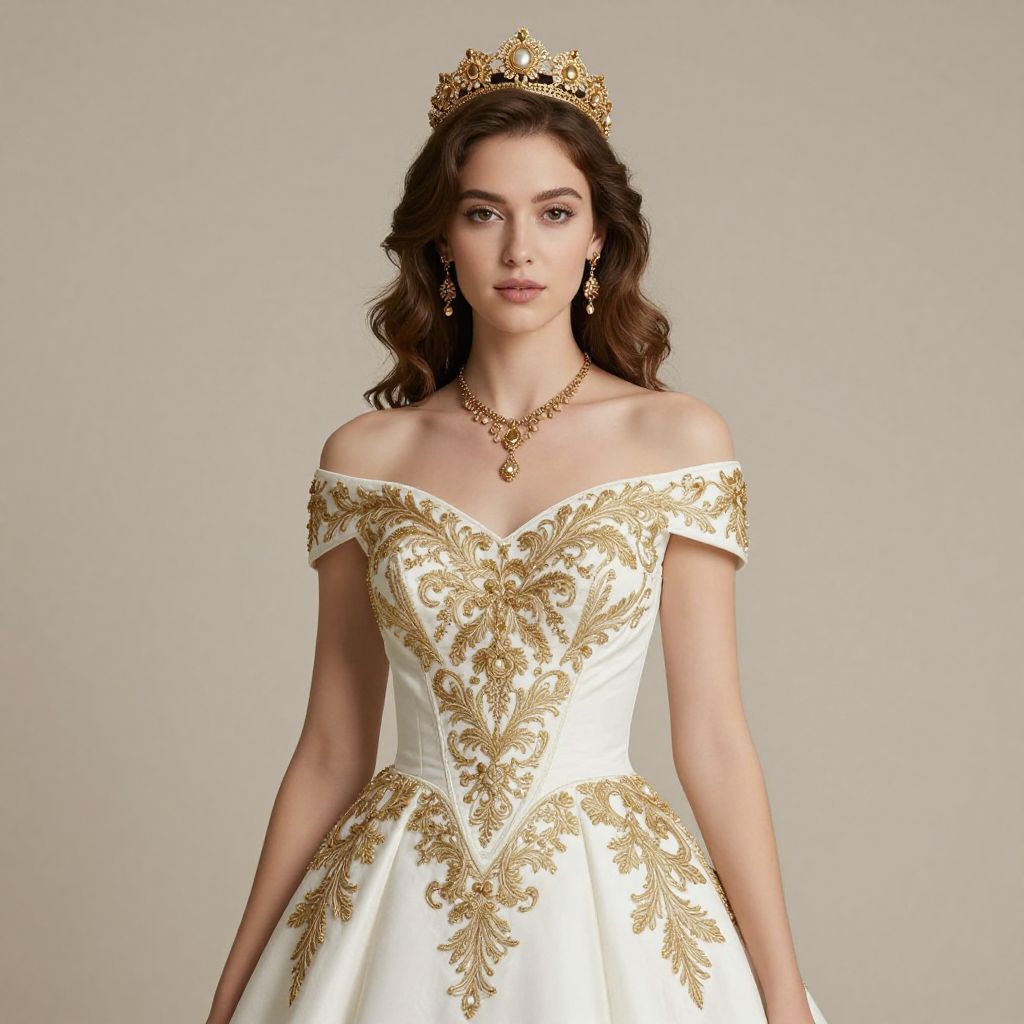 A mannequin wearing a elegant gold and white outfit with intricate embroidery, standing in a luxurious boutique setting. The outfit features a flowing white dress with gold accents, a high neckline, and a fitted bodice, while the crown on his head is ornate and sparkling with tiny gemstones, giving him a regal and fantastical appearance. The lighting is soft and warm, highlighting the textures of the fabric and the shimmer of the crown, with a slight reflection on the polished floor behind him.