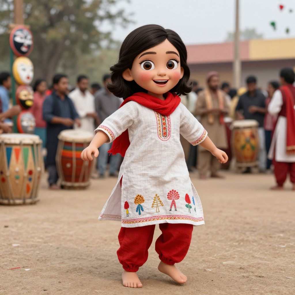A joyful girl with big brown eyes, rosy cheeks, and a bright red scarf wearing a playful linen salwar kameez costume, dancing barefoot in a village festival with colorful drums, traditional masks, and a lively crowd in the background
