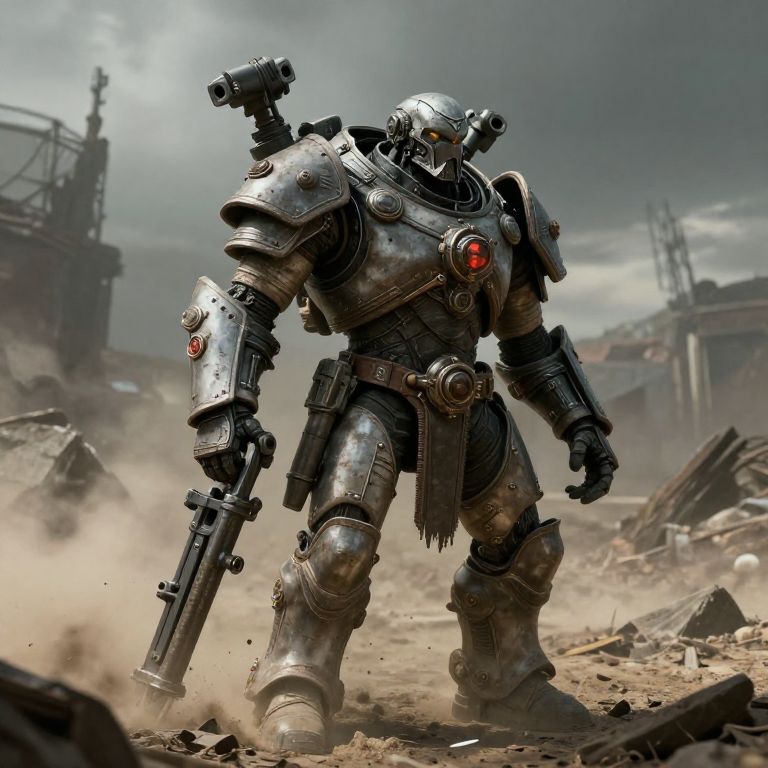 Photorealistic digital artwork depicting a massive, silver, humanoid robot standing in a war-torn, dusty urban environment. The robot has a bulky, armored body with intricate, mechanical details, and is equipped with a large gun in its right hand and a futuristic, spherical device on its left shoulder. Red circular emblems are visible on its chest and arms. The background shows rubble, broken buildings, and a cloudy, stormy sky, adding to the post-apocalyptic atmosphere. The robot's design combines industrial and cybernetic elements, giving it a formidable and imposing appearance.
