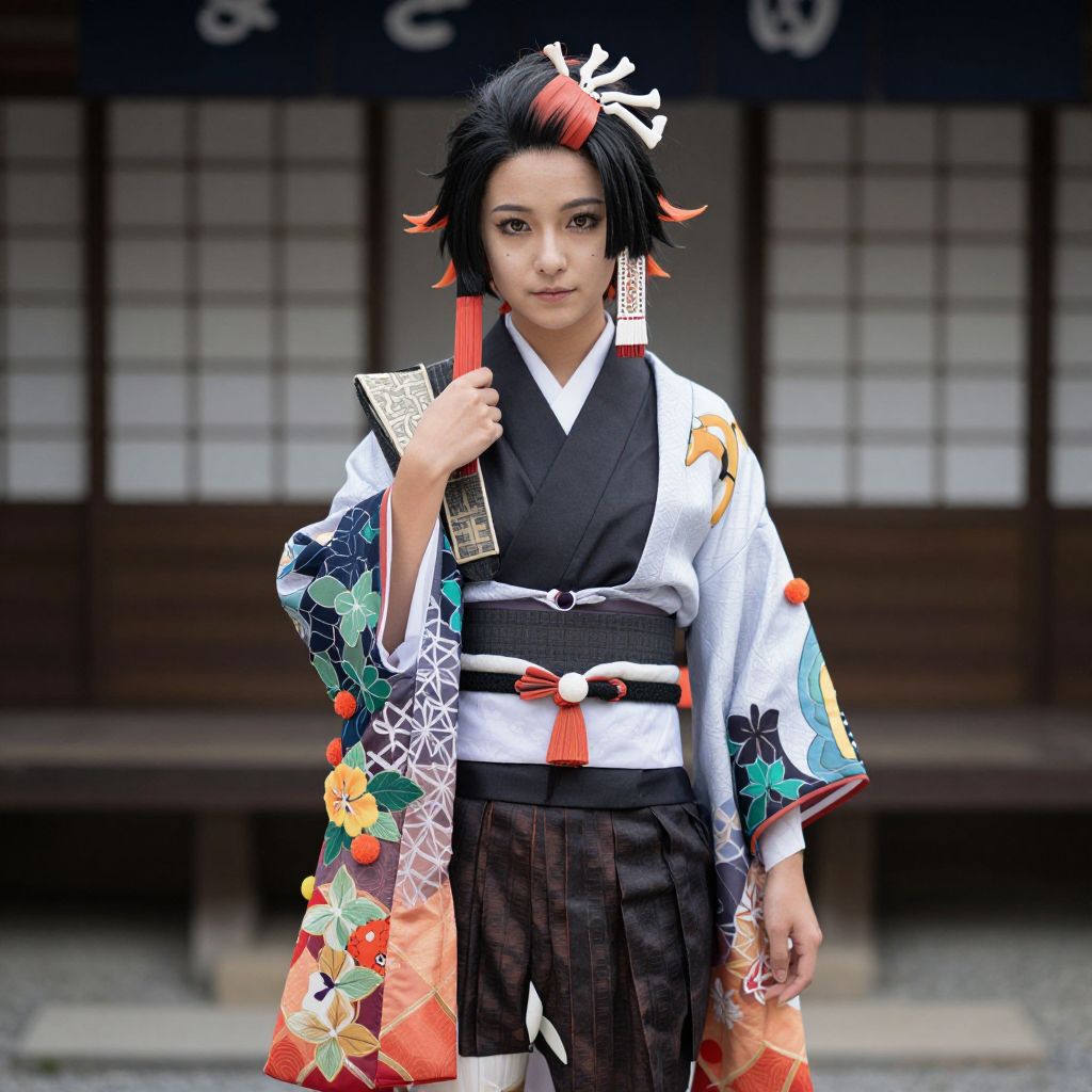 Rengoku Costume, woman in traditional japanese dress posing for a photo in front of a building