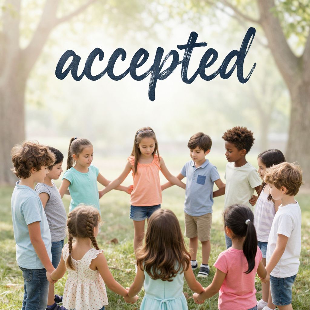 Children of different backgrounds holding hands in a circle, sunlight filtering through trees, the word 'accepted' in watercolor style above them, peaceful and harmonious scene, soft pastels, conveying unity and acceptance