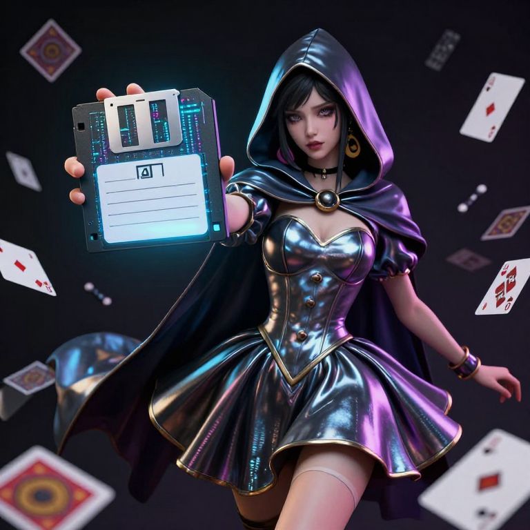 The image depicts a hyper-realistic, futuristic hacker, reminiscent of Alice in Wonderland, with a dramatic and 3D-rendered appearance. The character is adorned in a flowing, metallic dress with a hooded cloak, exuding an air of mystery and power. A large, intricate floppy disk, glowing with a matrix-like pattern, is held in the character's hand, symbolizing advanced technology and data manipulation. The background is dark, creating a stark contrast that highlights the character and the glowing floppy disk. Scattered around the character are numerous cards, adding to the surreal and fantastical atmosphere. The overall composition is dynamic, with the character positioned centrally, drawing the viewer's attention to the glowing floppy disk and the surrounding cards. The interplay of colors, textures, and shapes creates a visually rich and complex scene, capturing the essence of a futuristic hacker in a fantastical setting.