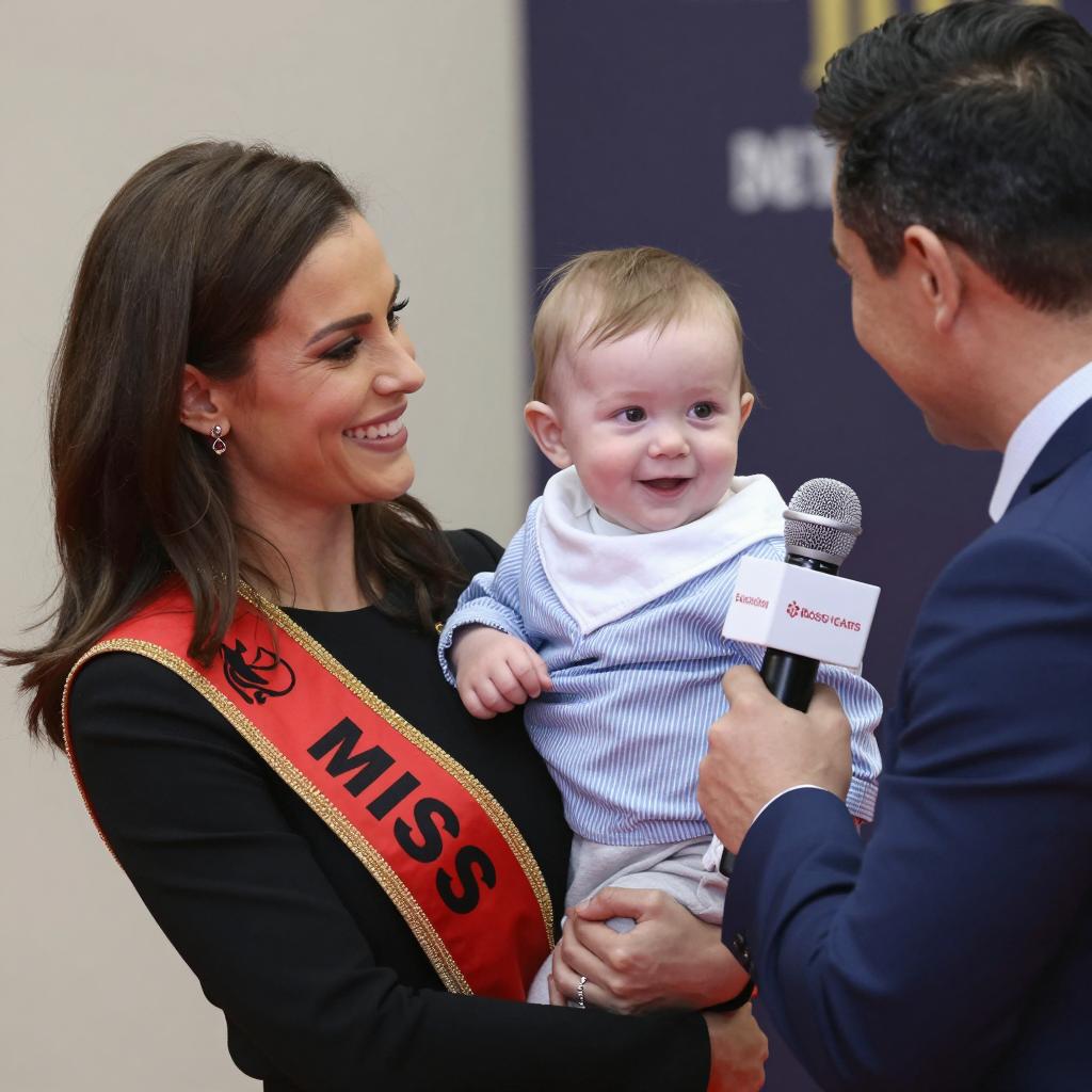 A woman with dark brown hair, wearing a black top and a red sash with "MISS" on it, smiling. She holds a baby with light brown hair, dressed in a blue striped shirt and white scarf, also smiling. A man with short dark hair, wearing a blue suit, holds a microphone with a white near the baby's face. Background is blurred with indistinct objects. Woman on the left, baby in the center, man on the right.