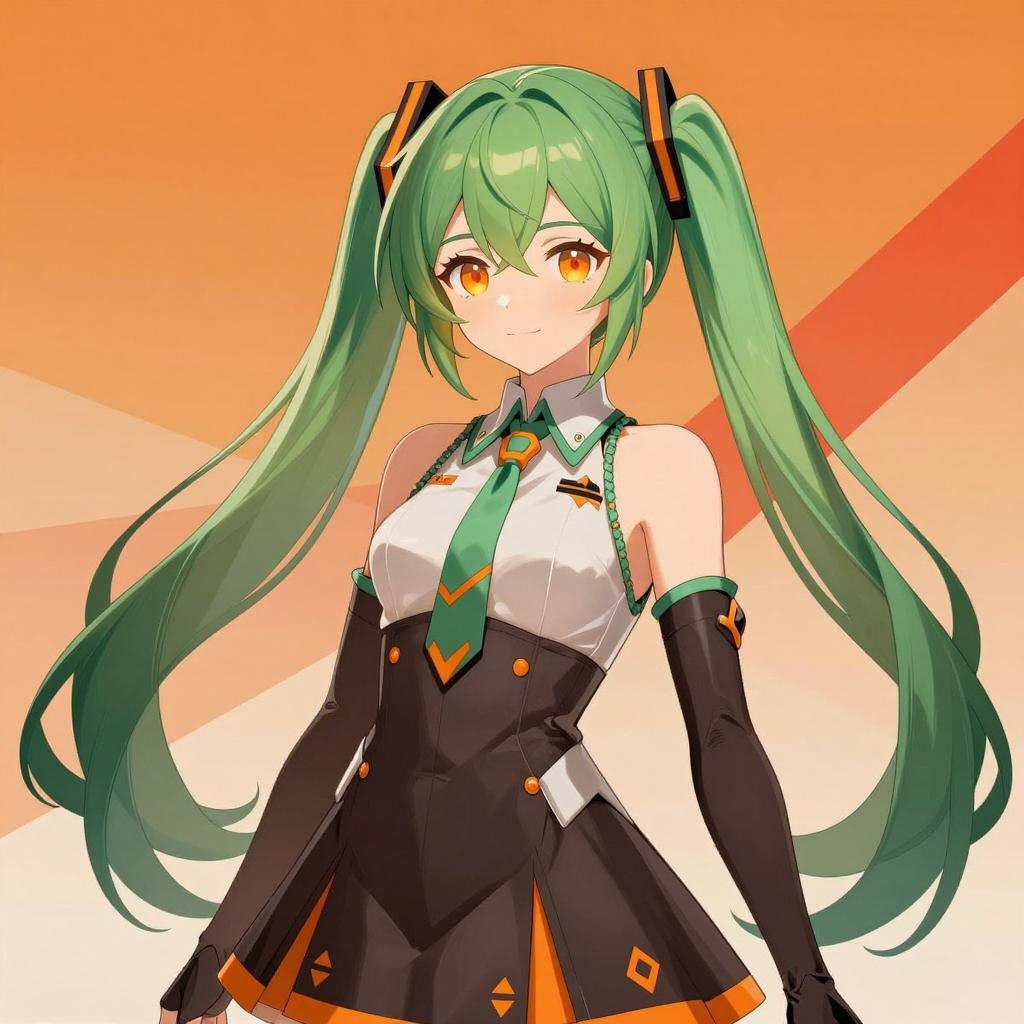Digital illustration of an anime-style female character with long green twintails styled in double buns, orange eyes, and large breasts. She wears a black and orange detailed dress with bare shoulders and fingerless black gloves. The background features abstract orange and red geometric patterns.