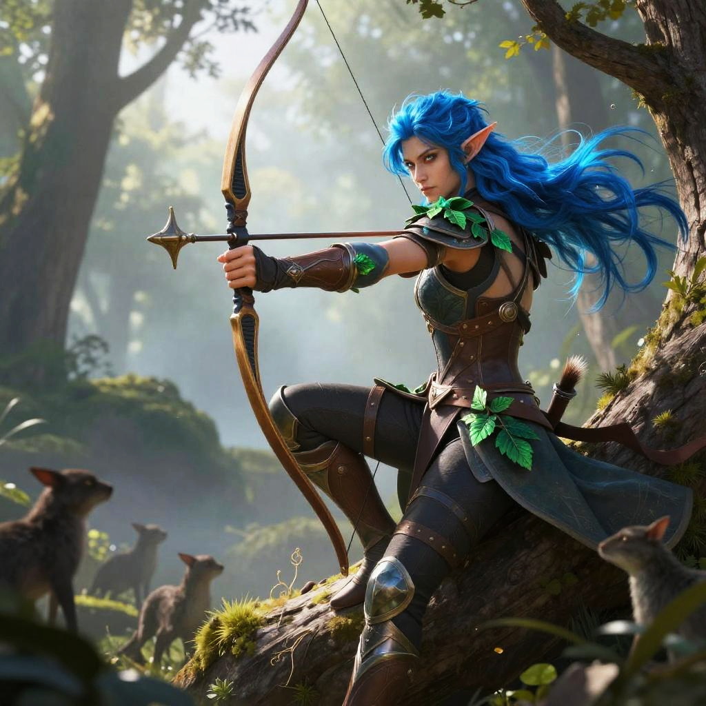 Digital illustration of a blue-haired, elf-like archer with pointed ears, wearing dark, leaf-adorned armor, standing on a moss-covered tree branch in a sunlit forest. She draws a bow with a golden arrow, her intense gaze focused forward. Her long, wavy blue hair flows in the breeze. In the background, several small, brown forest creatures with large ears and fluffy tails gaze up at her. The forest is dense with tall trees and dappled sunlight filtering through the leaves. The scene is vibrant and dynamic, with a fantasy, adventure theme.