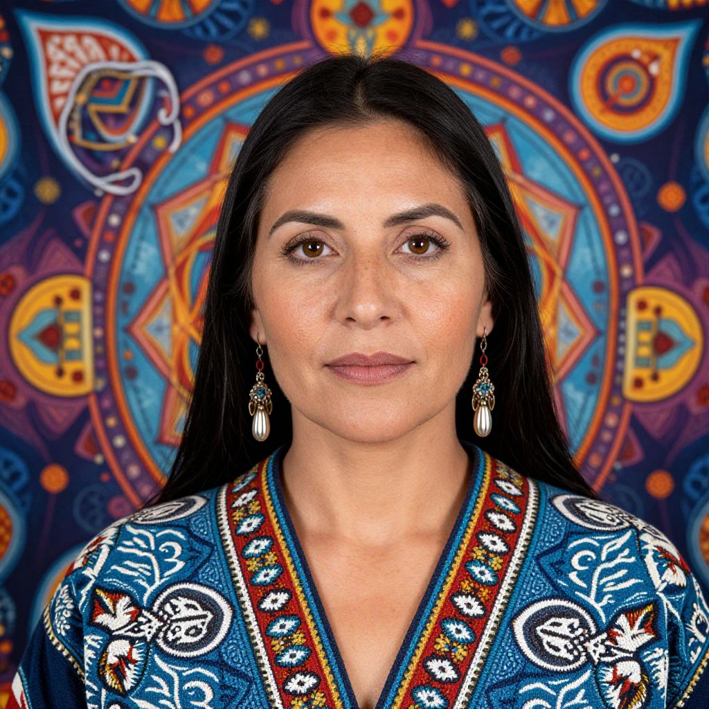 Photograph of a woman with long black hair, light brown skin, and brown eyes, wearing a blue, intricately patterned traditional garment with white, red, and orange embroidery. She has silver drop earrings and a neutral expression. The background features a colorful, mandala-like tapestry with orange, blue, and yellow geometric patterns. The woman is centered and directly facing the camera, with the tapestry providing a vibrant, textured backdrop. The image has a vivid, slightly stylized quality, emphasizing the rich colors and patterns.