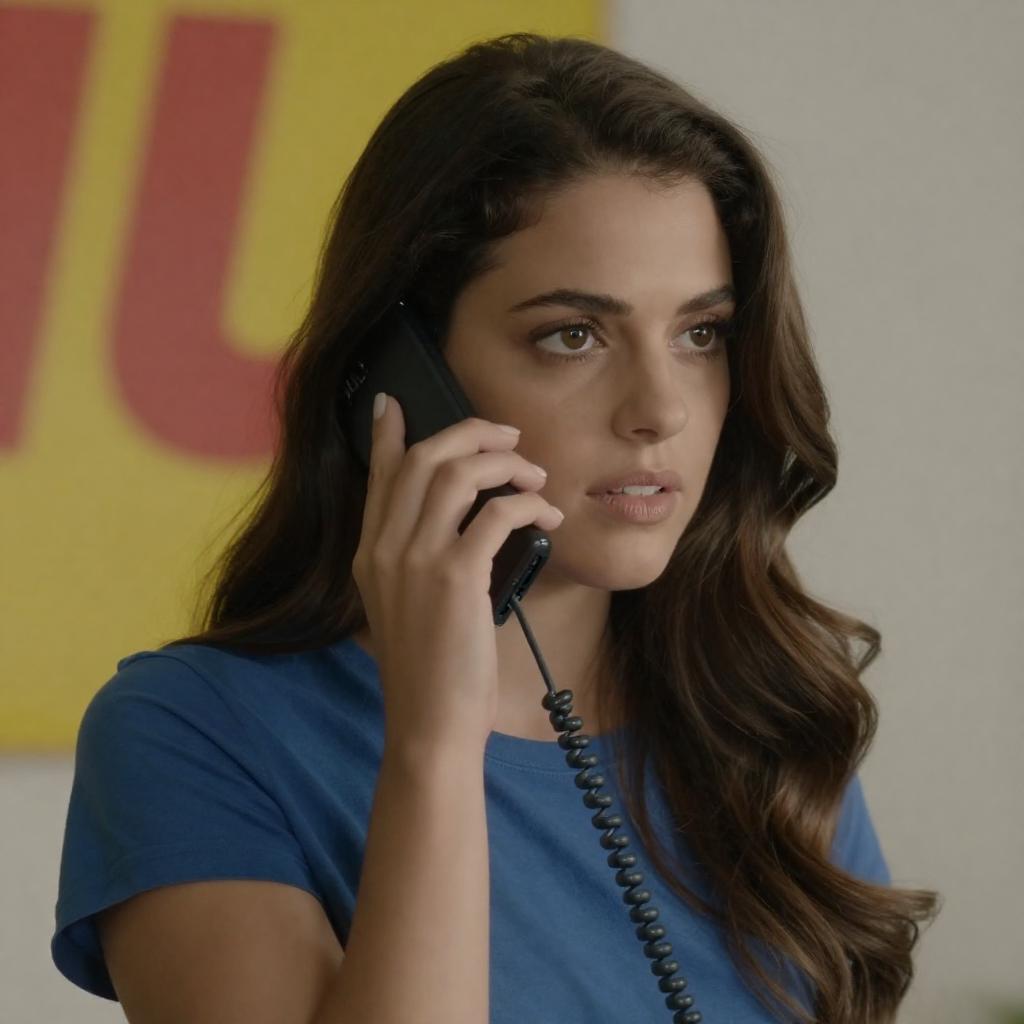 Photograph of a woman with long, wavy brown hair, wearing a blue t-shirt, holding a black corded phone to her ear. She has intense, focused eyes. Background includes a yellow and red patterned object. The woman is positioned slightly to the right.