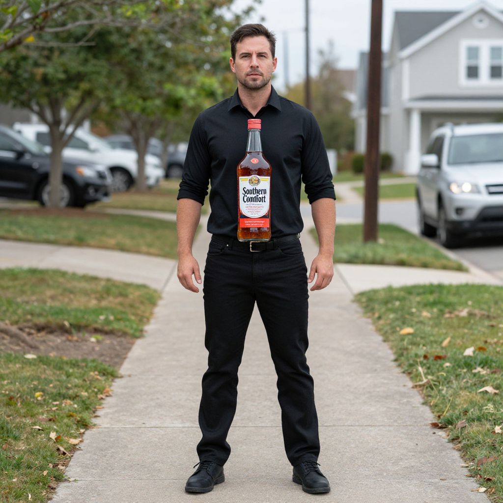 Photograph of a muscular, short-haired man with a trimmed beard standing on a suburban sidewalk. He wears a black long-sleeve shirt, black pants, and black shoes. A large bottle of Jameson Irish Whiskey is humorously placed upside-down between his chest and waist, with the label clearly visible. The background includes a blurred suburban neighborhood with green grass, trees, parked cars, and a white house. The man's expression is neutral, and he stands with his arms slightly away from his body. The overall image is bright and colorful, with a playful, surreal element.