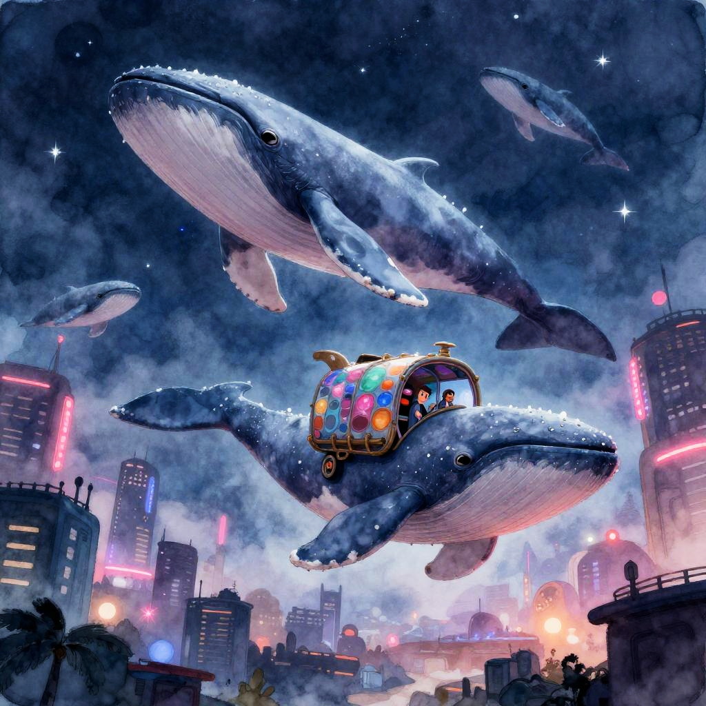 Sentient Air-Whales Over Neon Cityscape