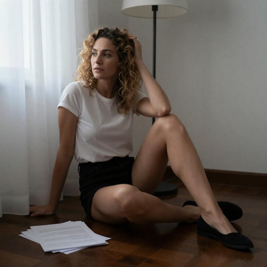 Sunlit Curly-Haired Woman on Dark Floor