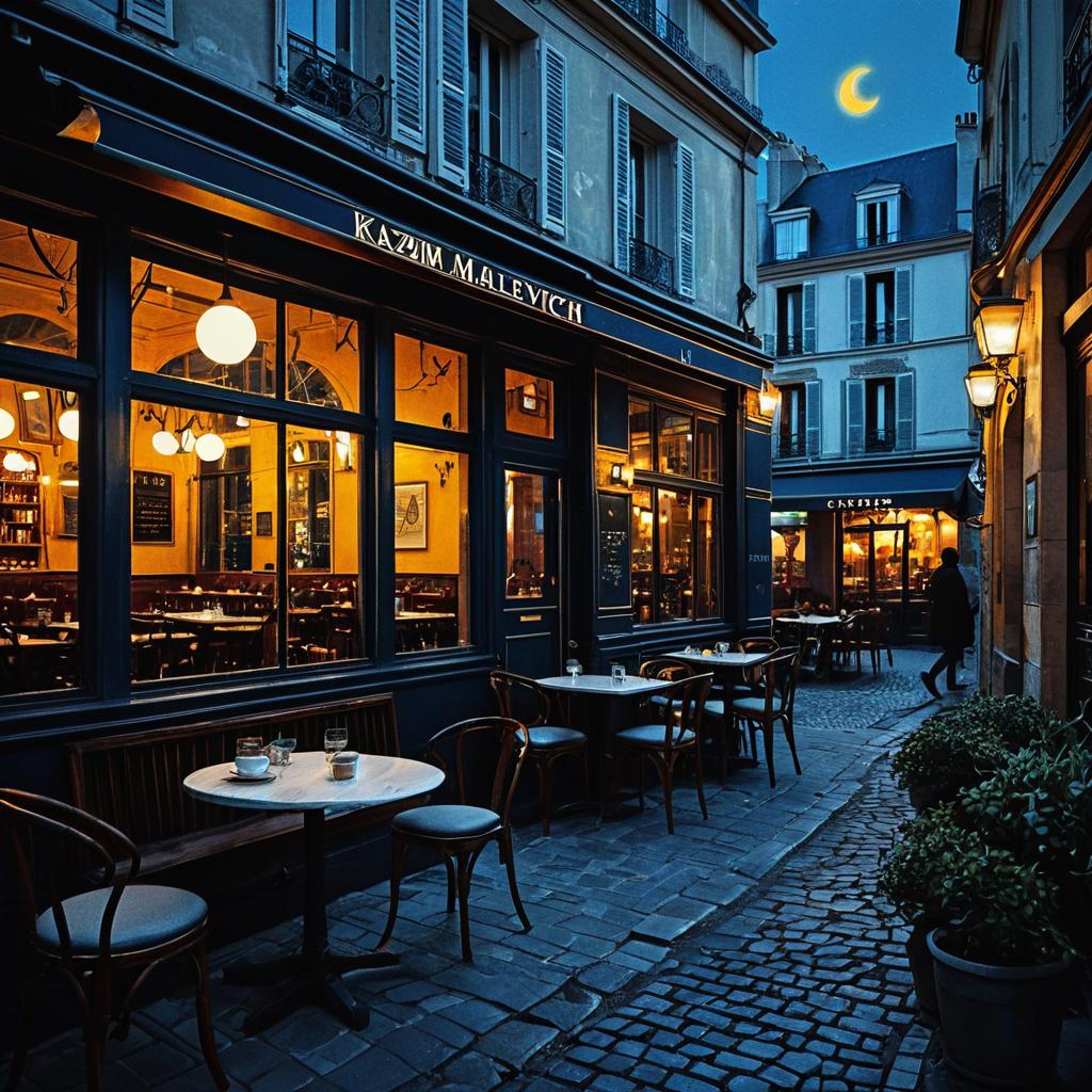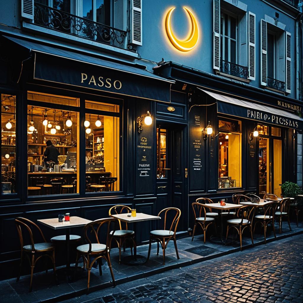 Photorealistic image of an evening Paris-style street cafe with warm glowing interiors and dimly lit outdoor seating on cobblestone pavement. The scene features a prominent platinum crescent moon medallion sign illuminated against a starry night sky, creating a cozy and artistic atmosphere. Detailed reflections, classic French architecture, vintage lamps, and neatly set tables highlight the intimate ambiance of this quaint country village setting.