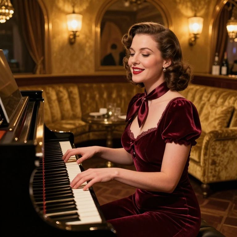 A timeless 1930s piano lounge singer with a refined facial structure and gentle smile, sitting at a black walnut piano in a lavish, golden-hued lounge with velvet sofas and dim lanterns, her hands gracefully moving over the keys while she sings softly, wearing a soft burgundy velvet bodysuit with lace trim and a silk scarf draped over her shoulders, the room exudes the soft glam of the era, filled with the warmth of vintage jazz