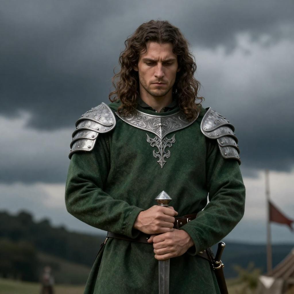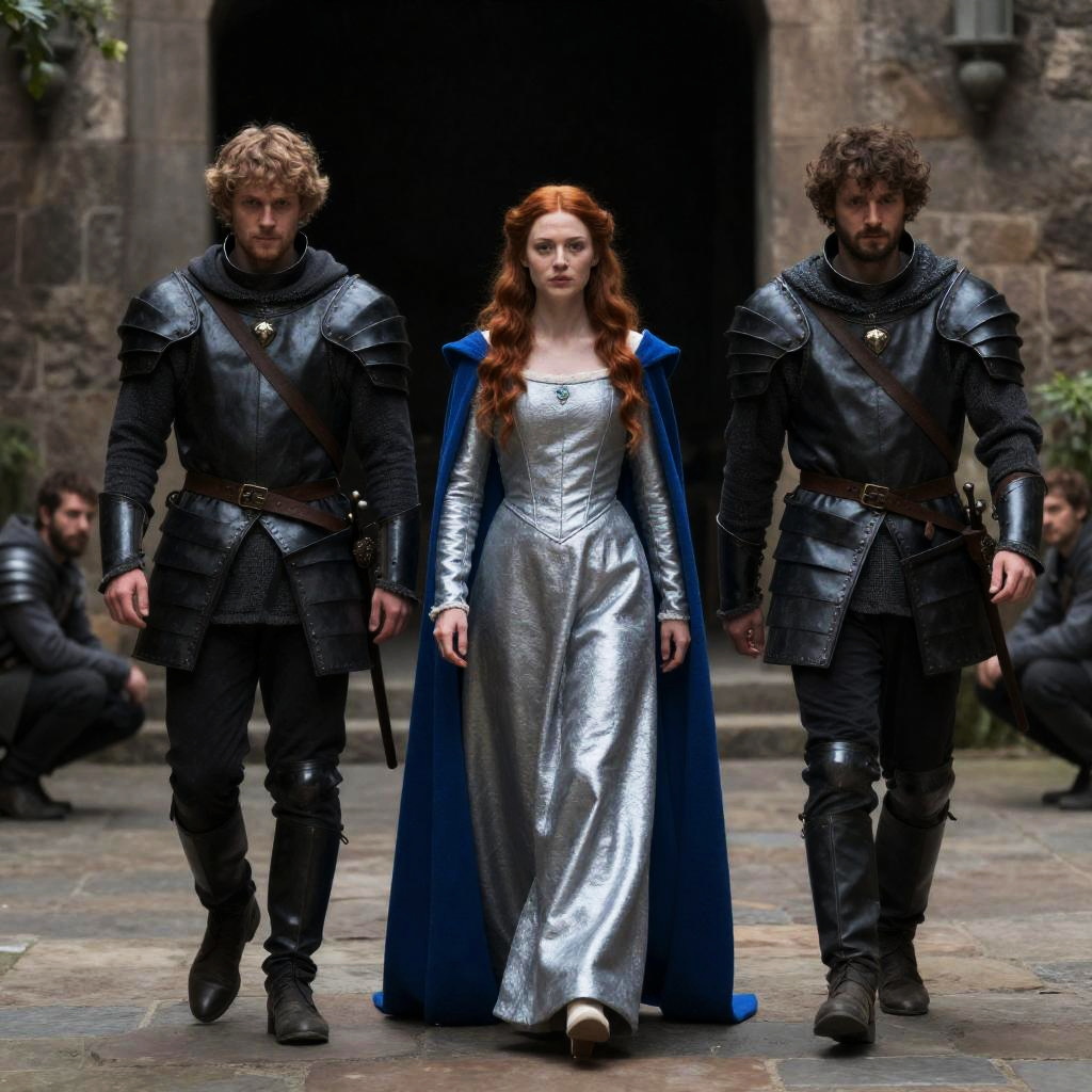 Group of six medieval warriors in armor and cloaks, standing and kneeling in front of a red backdrop. Central figure with brown hair, wearing brown leather vest and cloak, holding sword. Others have various expressions, some serious, some neutral. Ropes and wooden shield in foreground. Red and gold details on clothing. Wooden ures and metallic armor. Bright outdoor setting.