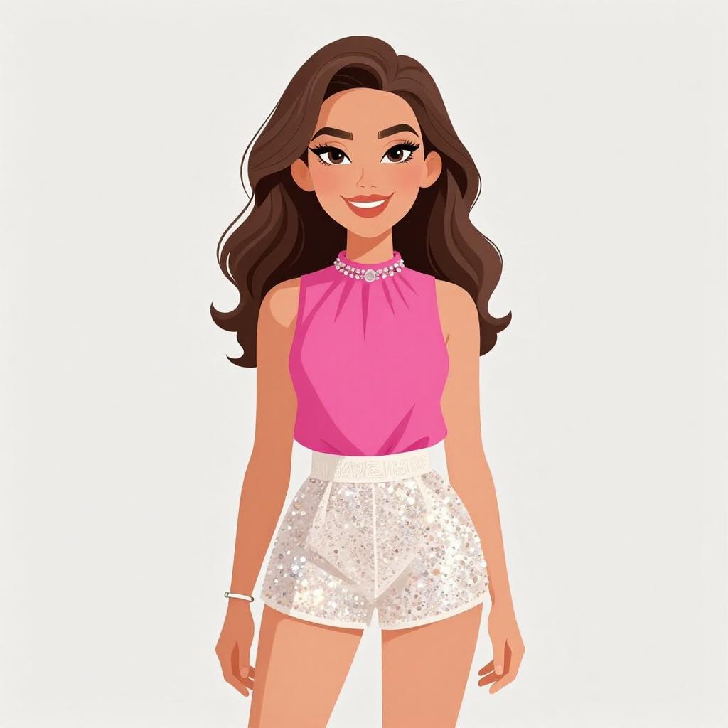 Woman with pretty face and pretty hair. smiling Woman, glam, sleeveless hot pink blouse with embellished high neck, loose fit, white sequined shorts with a shimmering finish, fitted and high-waisted, simple silver wrist bracelet, styled with loose waves in hair. --sref 1467