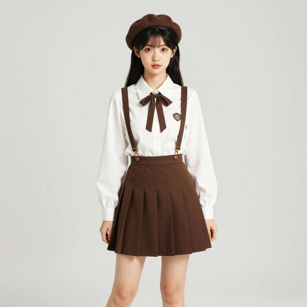 Portrait of a young East Asian woman wearing a vintage-inspired outfit consisting of a white blouse with a brown bow tie, brown pleated skirt with suspenders, and a matching brown beret. She stands confidently against a plain light gray background, showcasing a classic retro style with an elegant, polished look.
