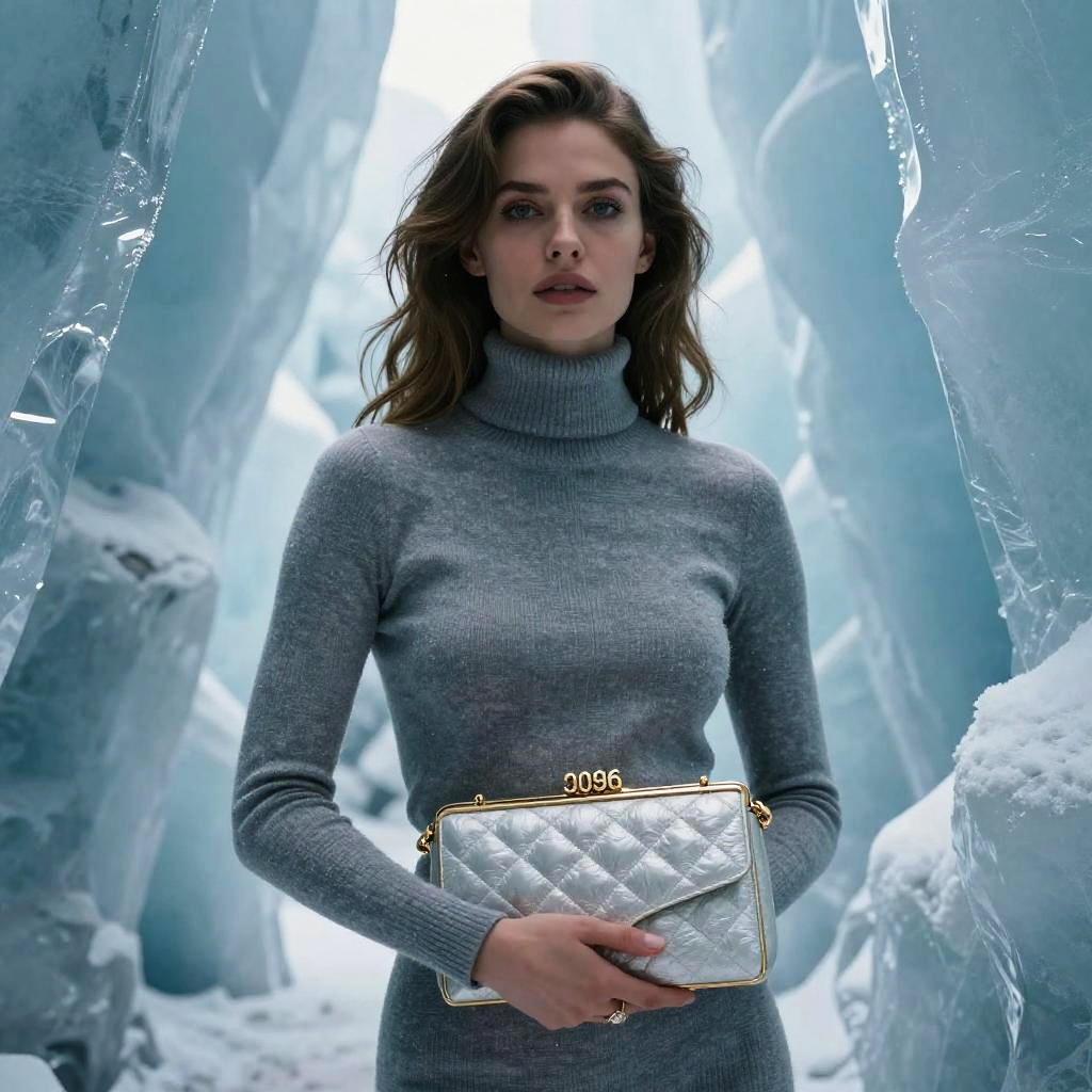 Photograph of a young Caucasian woman with fair skin, brown wavy hair, and blue eyes standing in an icy cave. She wears a gray, long-sleeved, turtleneck sweater and holds a quilted, silver clutch with a gold frame. The background features towering, translucent ice formations with a bright, white light illuminating them from behind. Her expression is neutral, and she looks directly at the camera. The image has a cool, blue-toned color palette, emphasizing the icy environment. The clutch has the number "0036" on it.