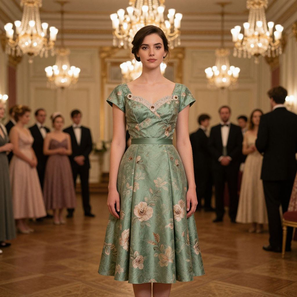 Elegantly poised in a vintage-inspired green dress adorned with floral patterns, a woman stands confidently in a grand ballroom, surrounded by guests in formal attire under the glow of ornate chandeliers.