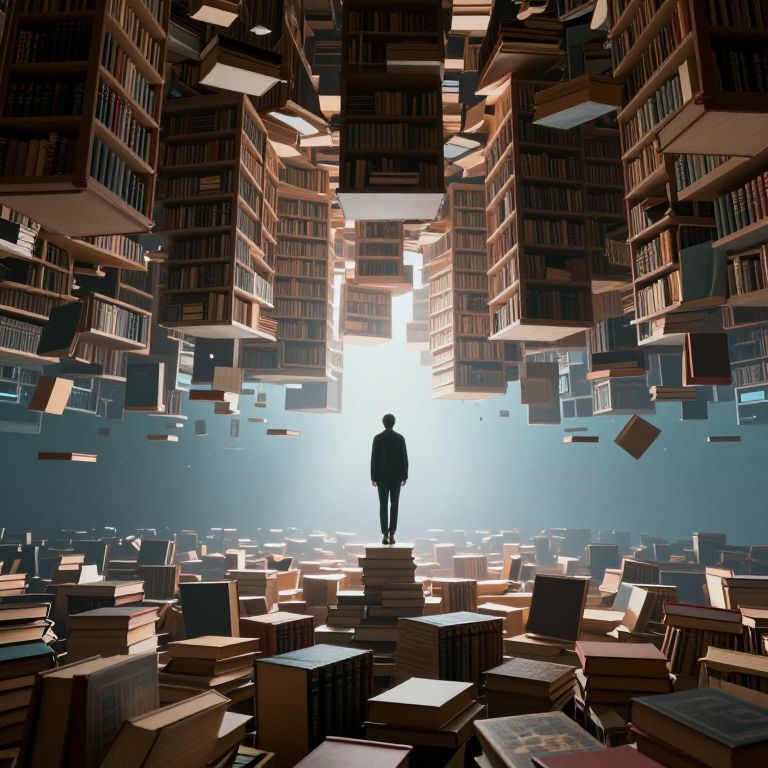 Digital artwork depicting a silhouetted figure standing at the center of a vast, illuminated library. The figure, in a dark, shadowy form, is surrounded by floating and scattered books of various sizes. Tall, wooden bookshelves filled with books line the background, creating a maze-like effect. The light source at the back creates a bright, white glow, contrasting with the dark, shadowy foreground. The books appear to be in mid-air, adding a sense of motion and chaos to the scene. The overall style is modern, with a focus on dramatic lighting and composition.