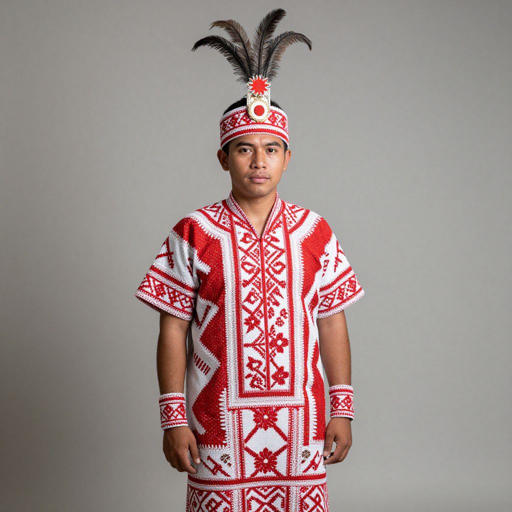 Traditional Philippine Ethnic Costume, man in a red and white dress with a feathered headdress