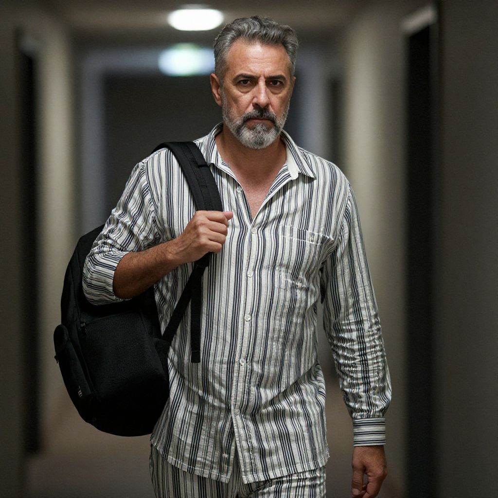 Photograph of a middle-aged man with a graying beard and short, gray hair, walking down a dimly lit, narrow hallway. He wears a black and white vertical striped button-up shirt and matching pants, with a black backpack slung over his right shoulder. His expression is serious and slightly intense. The hallway has dark, out-of-focus doors on either side, with a single bright overhead light at the end. The lighting casts subtle shadows, adding depth to the scene. The image has a sharp focus on the man, with a blurred background.